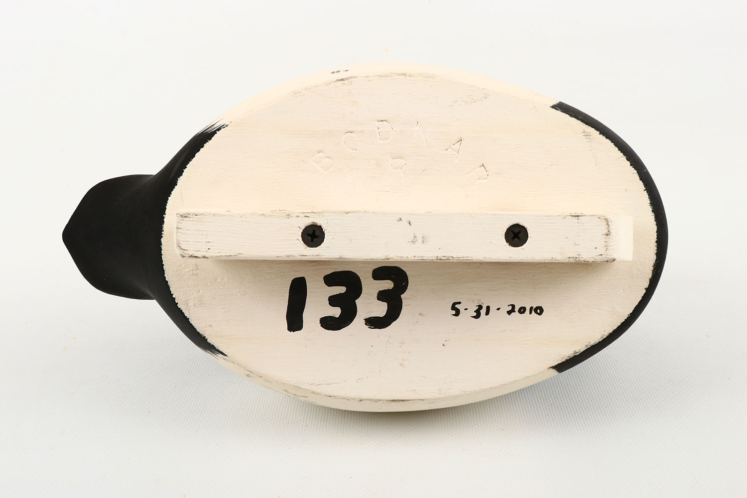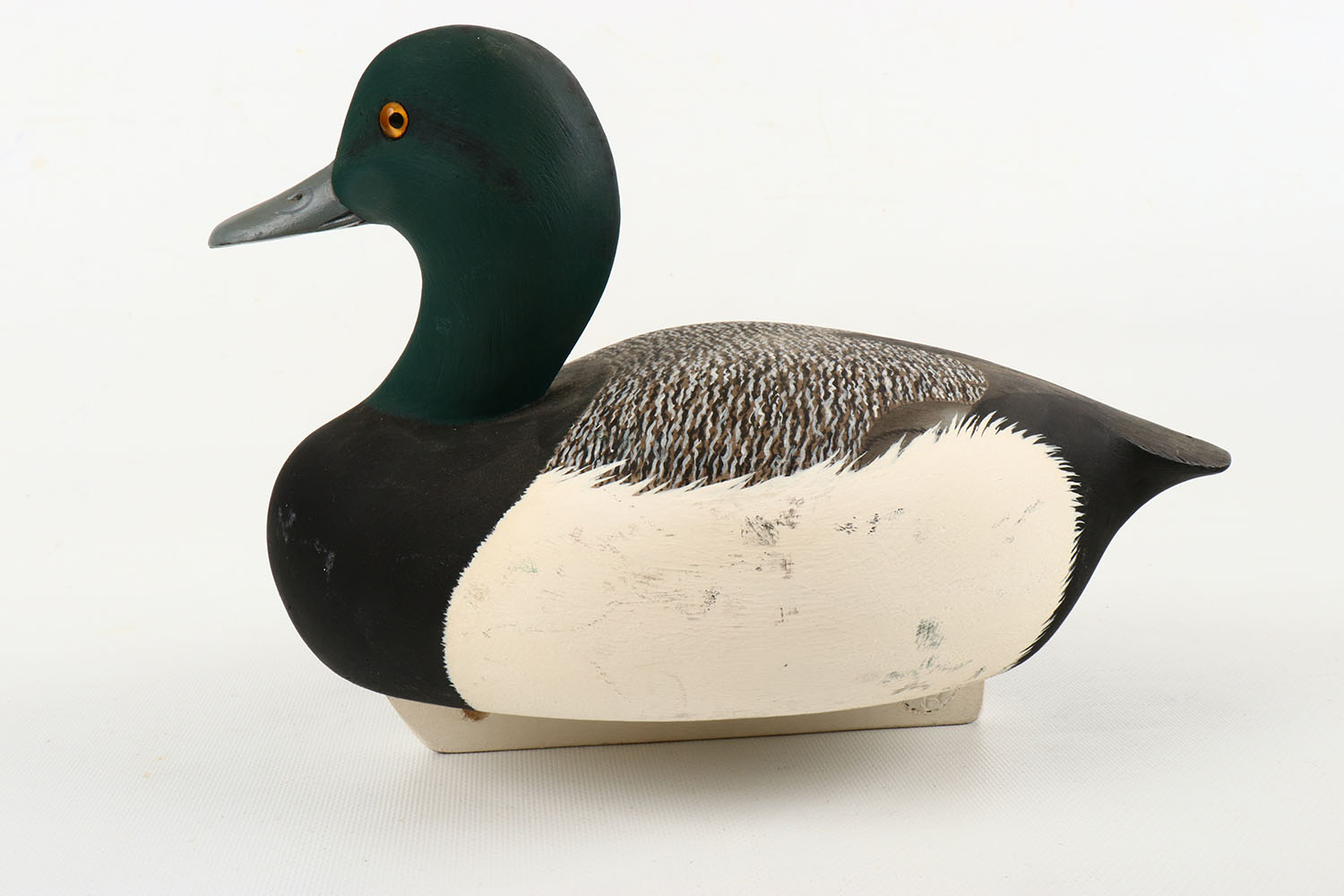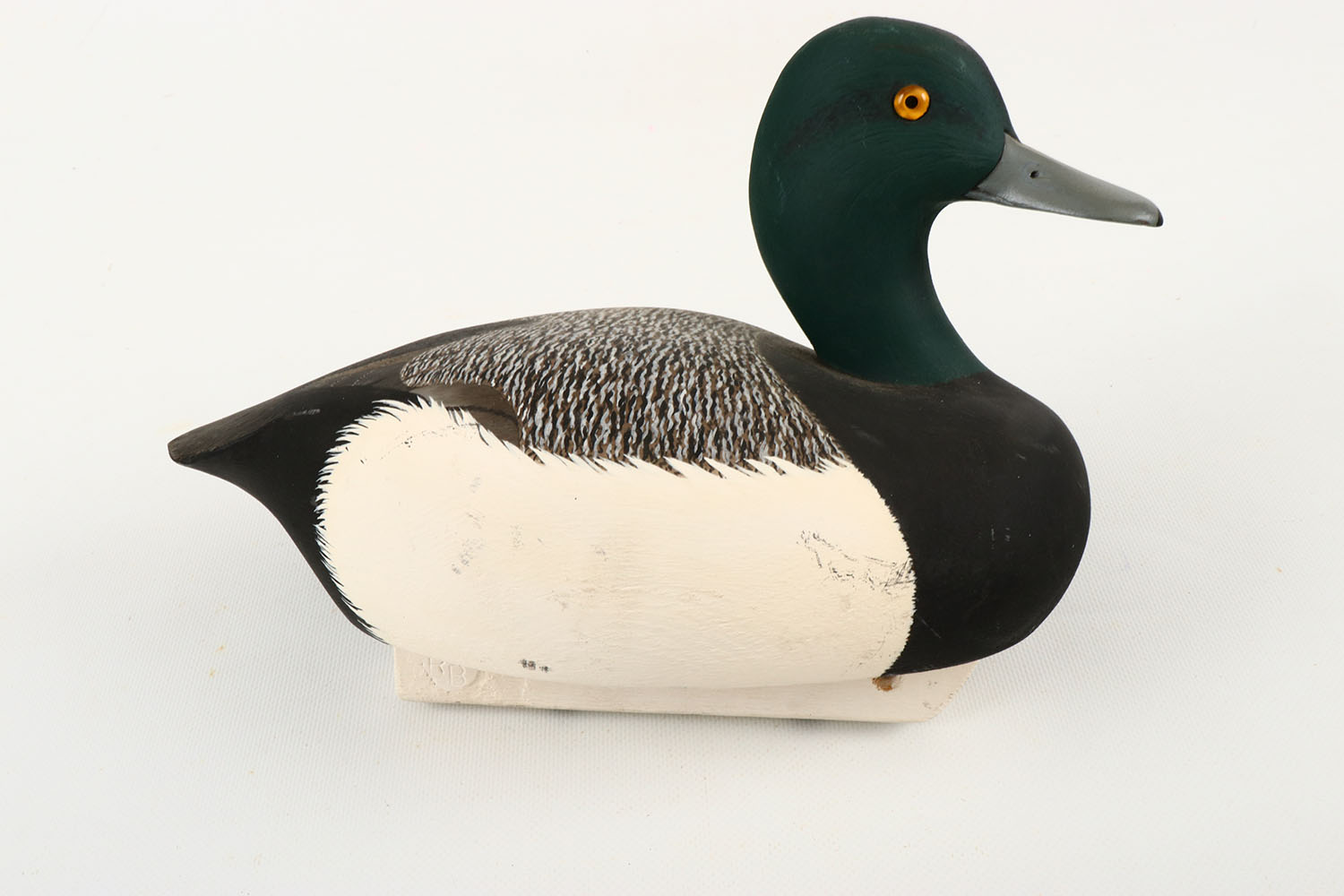 Bluebill Drake by Bodnar R, glass eyes, structurally excellent, solid wood, excellent original paint, has branded RMB on bottom. Grade: Excellent ++ - Value: 40 to 150