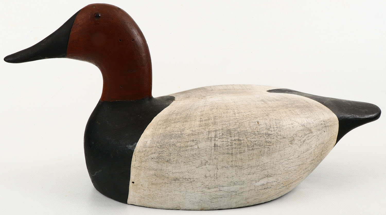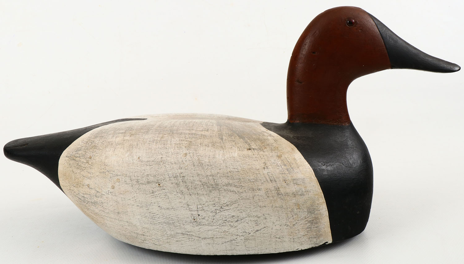 Canvasback Drake by unknown maker, glass eyes, structurally excellent, solid wood, excellent original paint. Grade: Excellent + - Value: 40 to 150