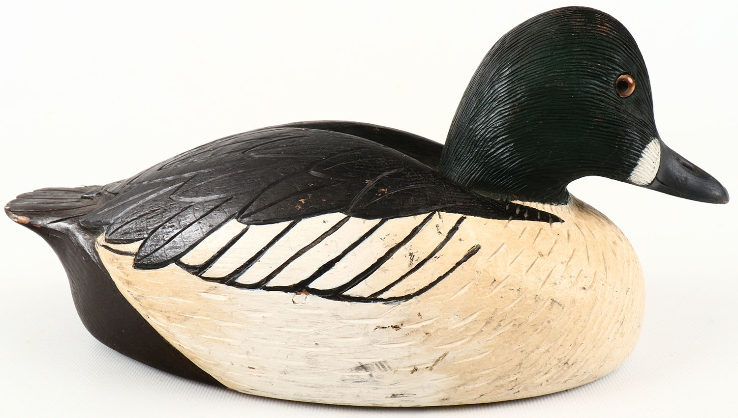Goldeneye Drake by unknown maker, glass eyes, structurally excellent, solid wood, excellent original paint, has branded JC and TTO on bottom. Grade: Excellent - Value: 40 to 150