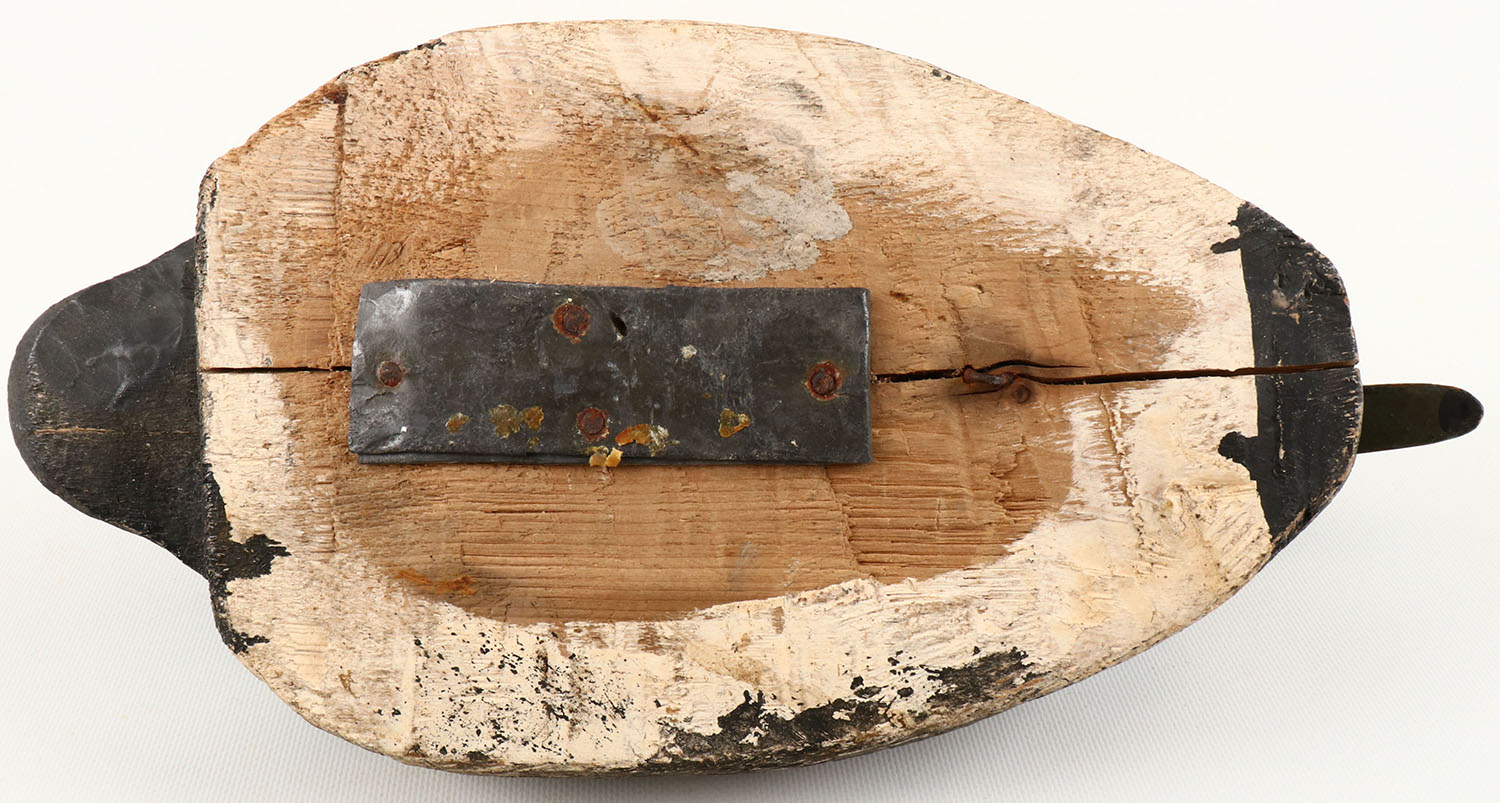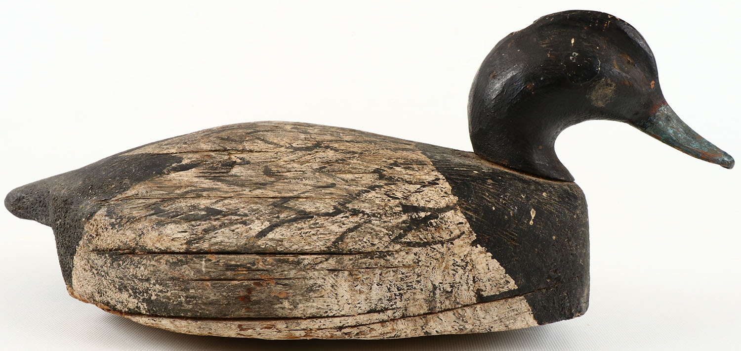Bluebill Drake by unknown maker, painted eyes, solid wood, has hairline cracks on sides and on bottom, excellent original paint with typical wear. Grade: Very Good ++ - Value: 40 to 150