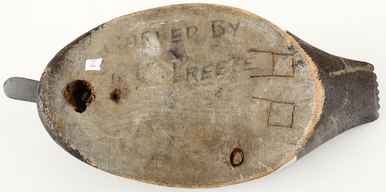 Bluebill Hen by L REETE?, CAN, glass eyes, structurally excellent, solid wood, neck has age crack, excellent original paint with typical wear. Grade: Very Good ++ - Value: 50 to 150