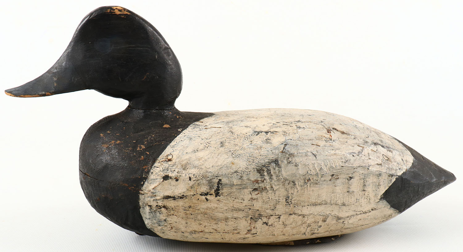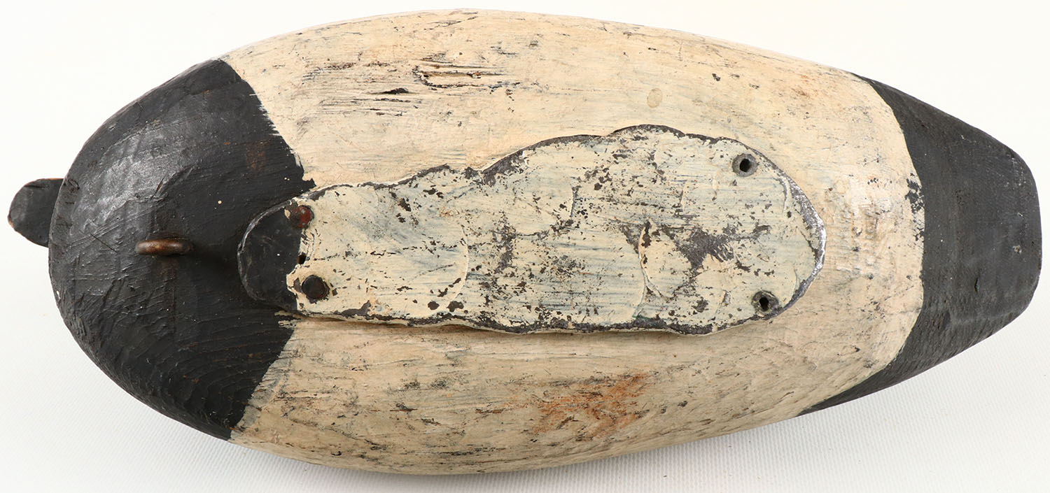 Bluebill Drake by unknown maker, painted eyes, structurally excellent, hollow wood, original paint with typical wear, plate on bottom is coming off. Grade: Very Good ++ - Value: 40 to 150