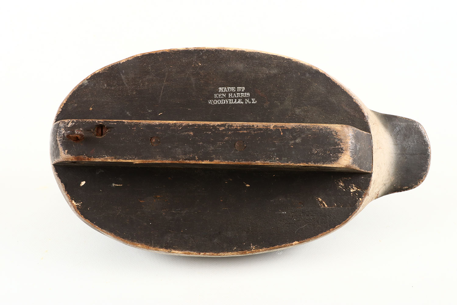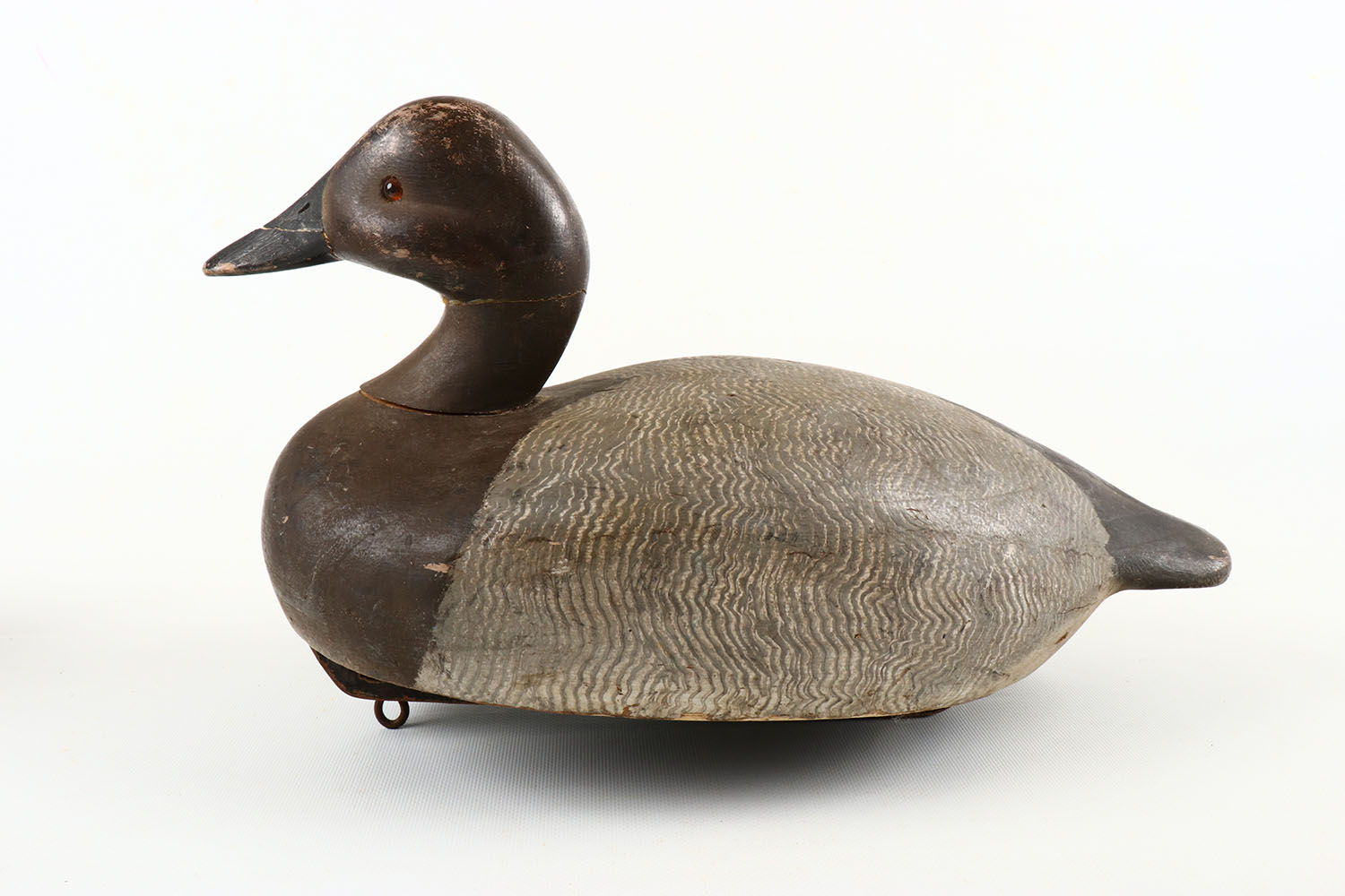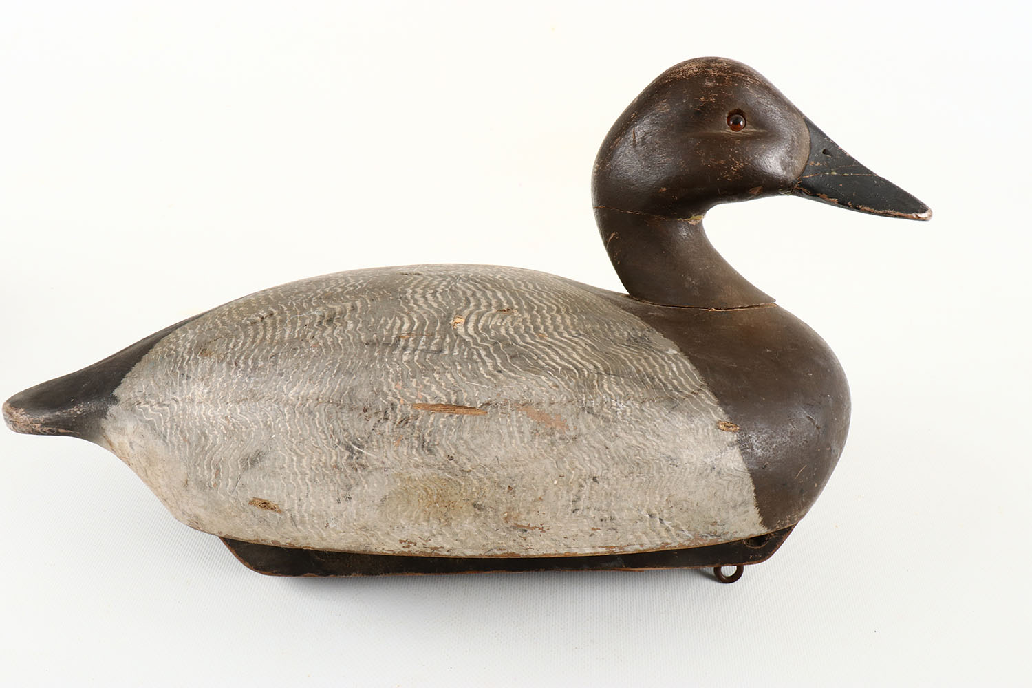 Canvasback Hen by Ken Harris, Woodville, New York, glass eyes, solid wood, has repaired bill and neck, comb painting to back, excellent original paint. Grade: Very Good - Value: 100 to 300