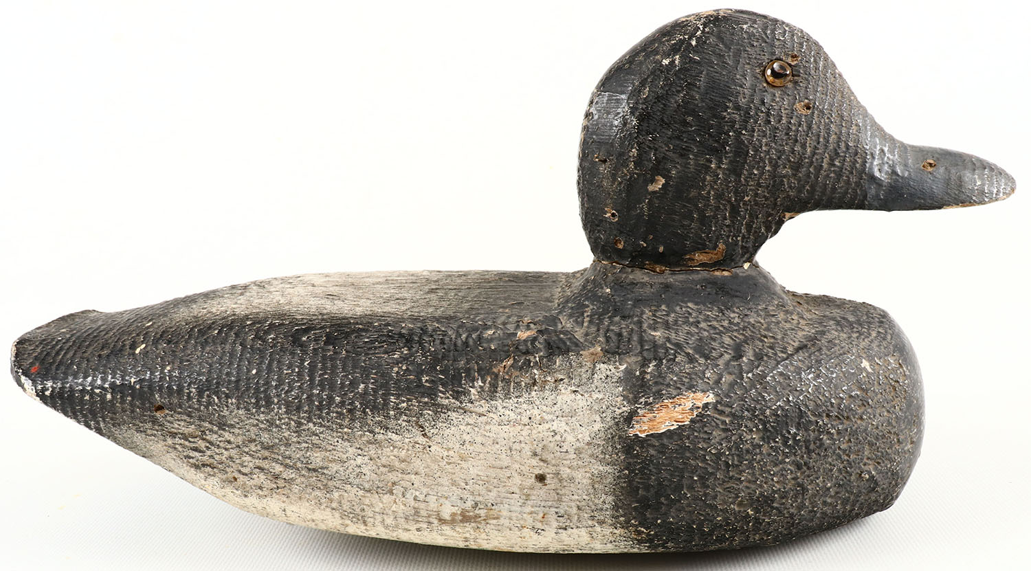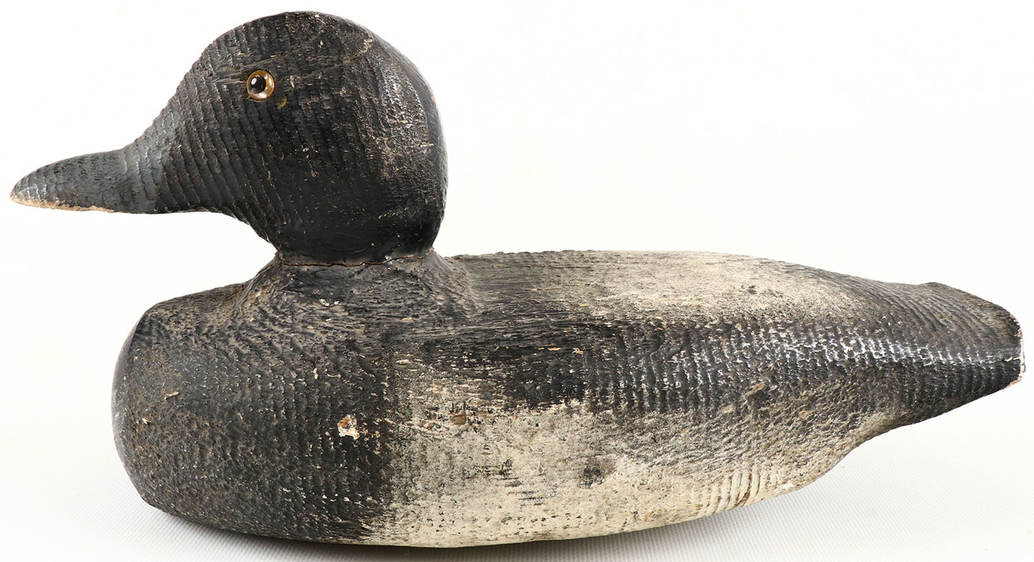 Bluebill Drake by unknown maker, glass eyes, structurally excellent, solid wood, neck filler shows crack, original paint with typical wear, Interesting Stamping on the bottom NO 10 BLUEBILL DECOY MADE IN USA. Grade: Very Good ++ - Value: 40 to 150