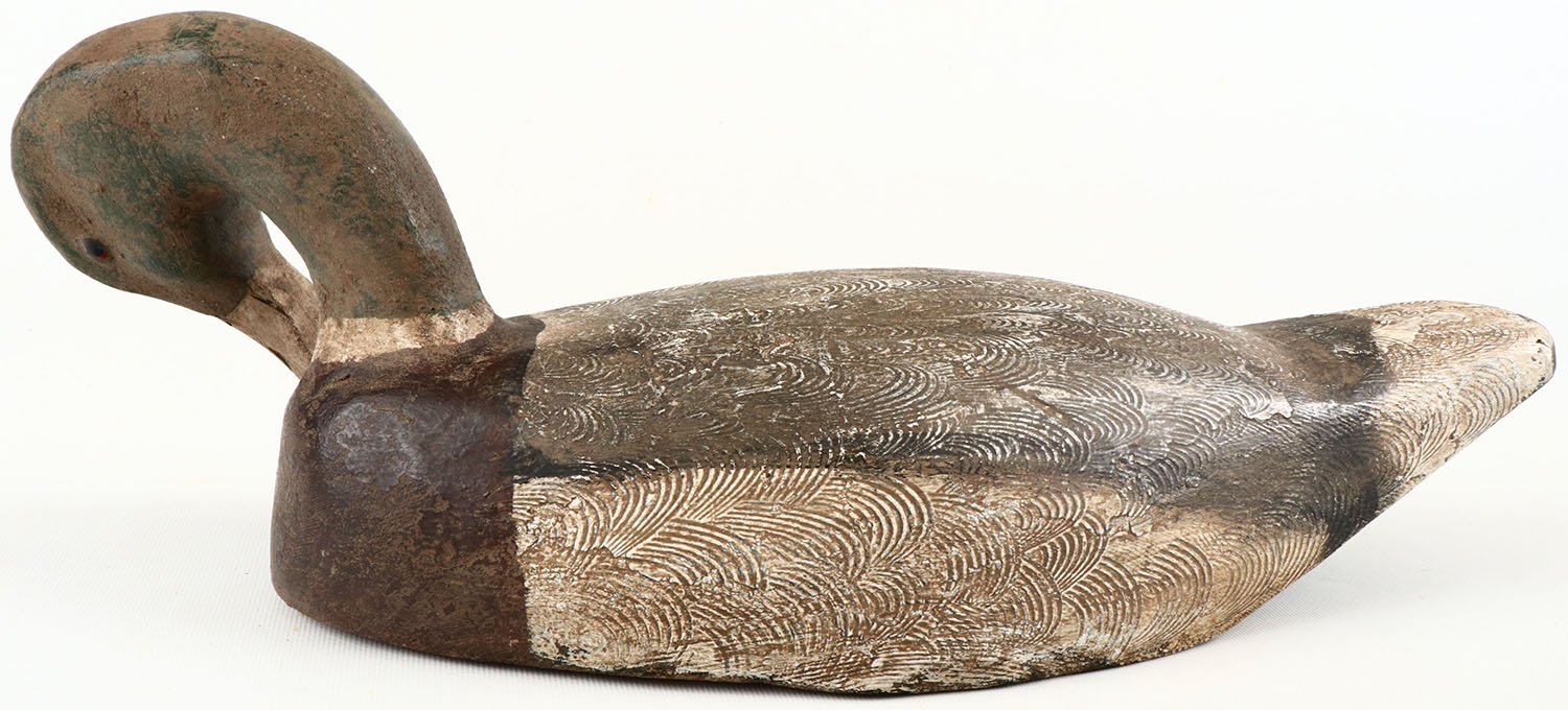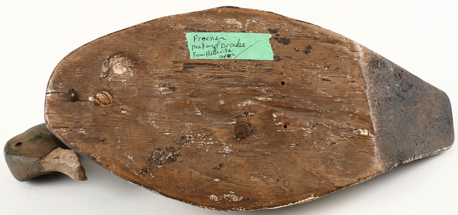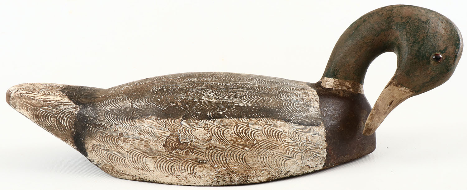 Preening Mallard Drake, by unknown maker, Bellevue Washington area, structurally excellent, solid wood, excellent original paint with comb painting. Grade: Excellent - Value: 40 to 150