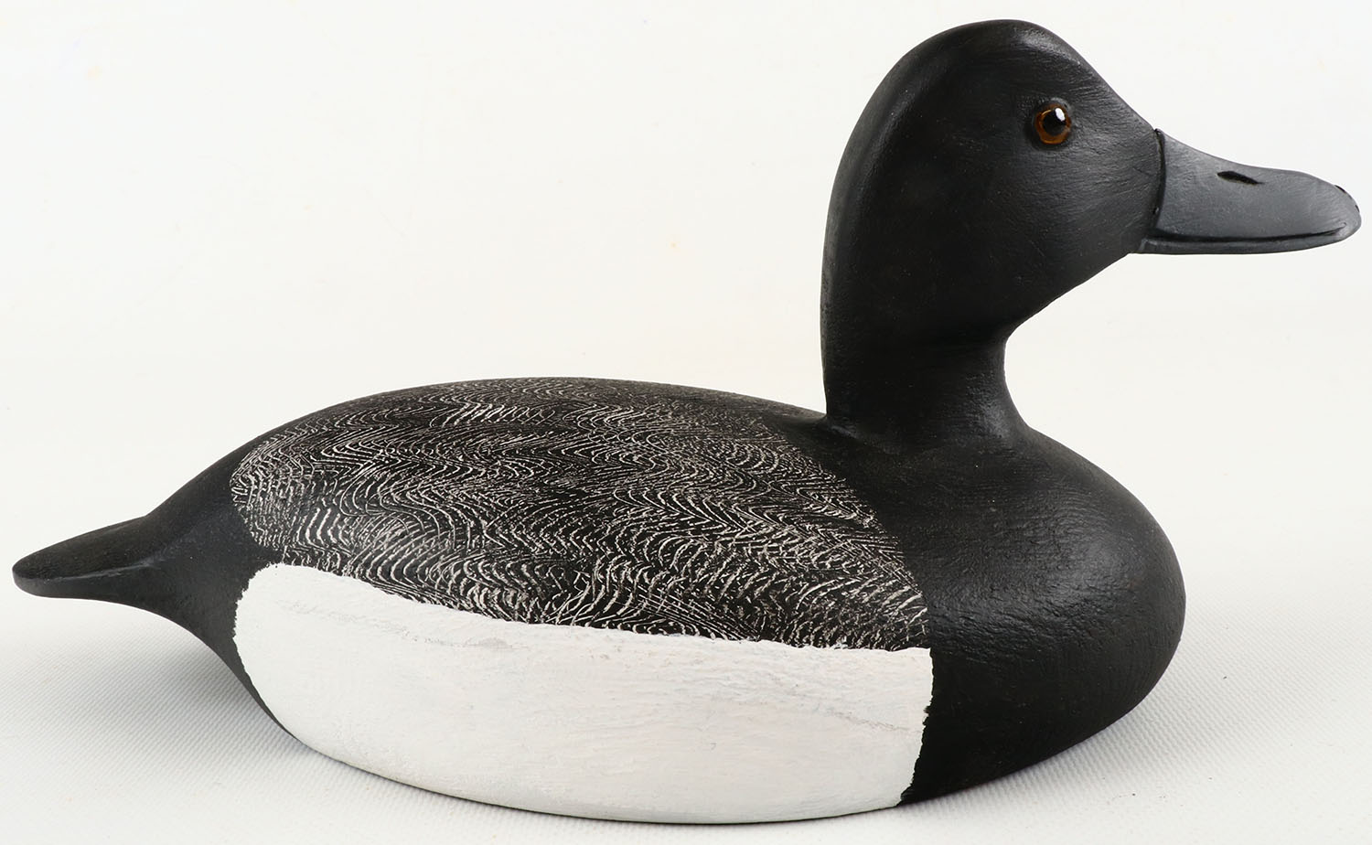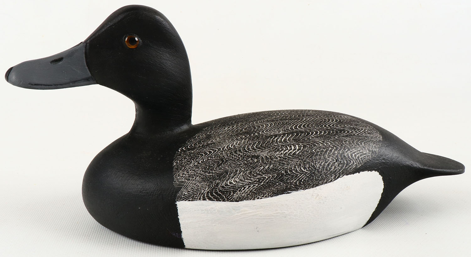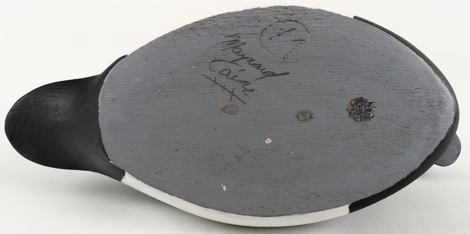 Bluebill Drake by Maynard Caine, Ontario, Canada, glass eyes, structurally excellent, solid wood, excellent original comb painting, excellent original paint, has branded MC on bottom. Grade: MINT - Value: 40 to 150