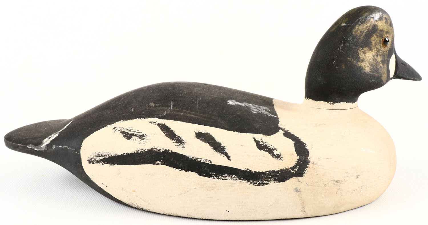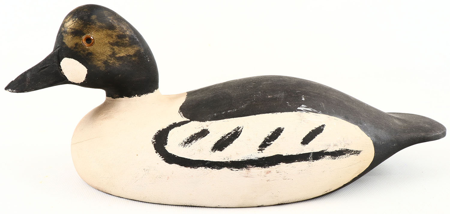 Goldeneye Drake by JFS (1984), glass eyes, structurally excellent, solid wood, excellent original paint, branded on bottom. Grade: Excellent - Value: 40 to 150