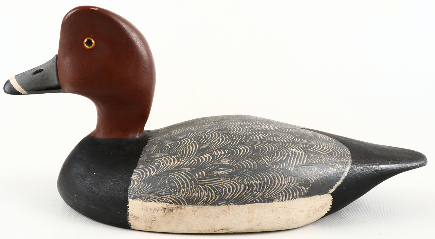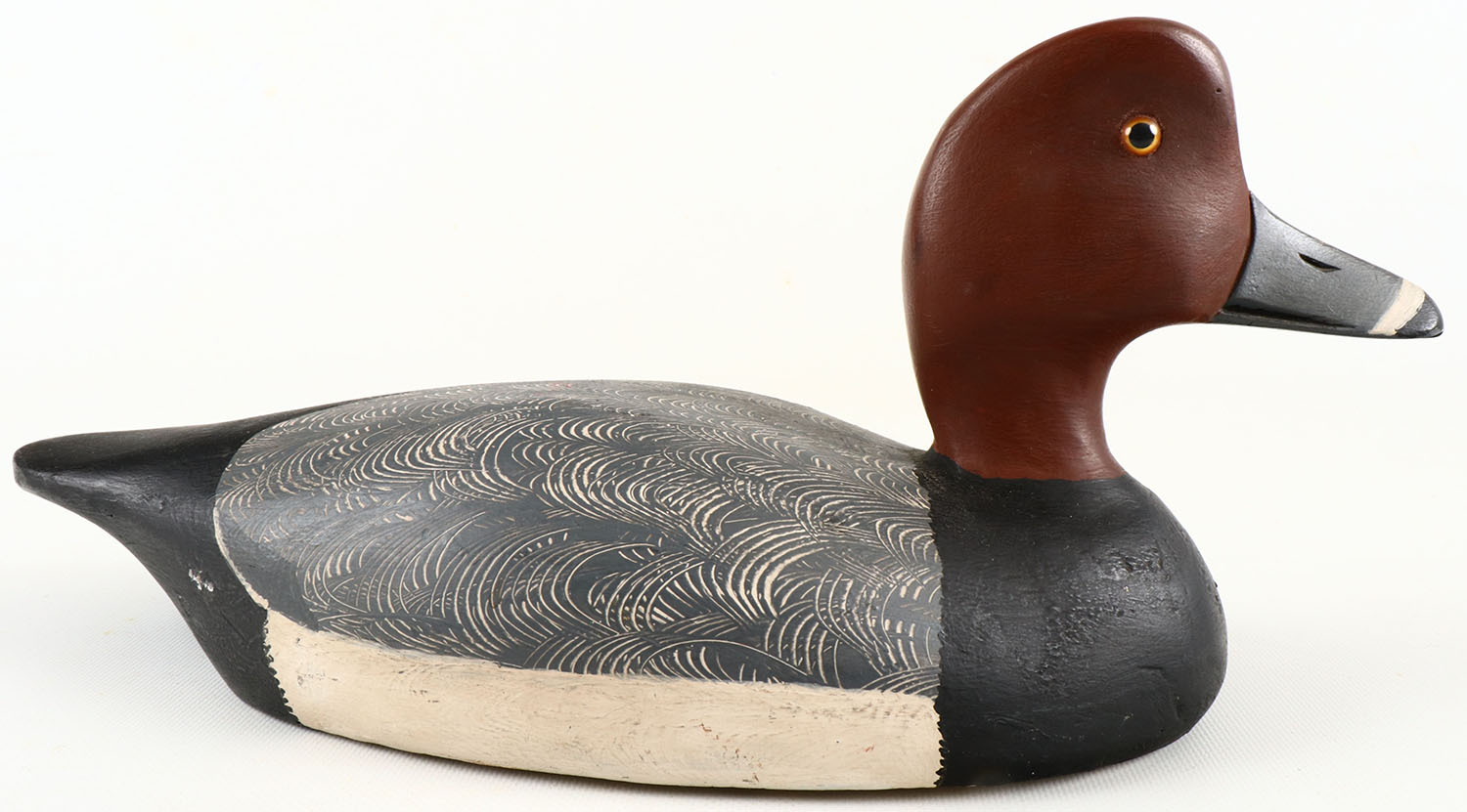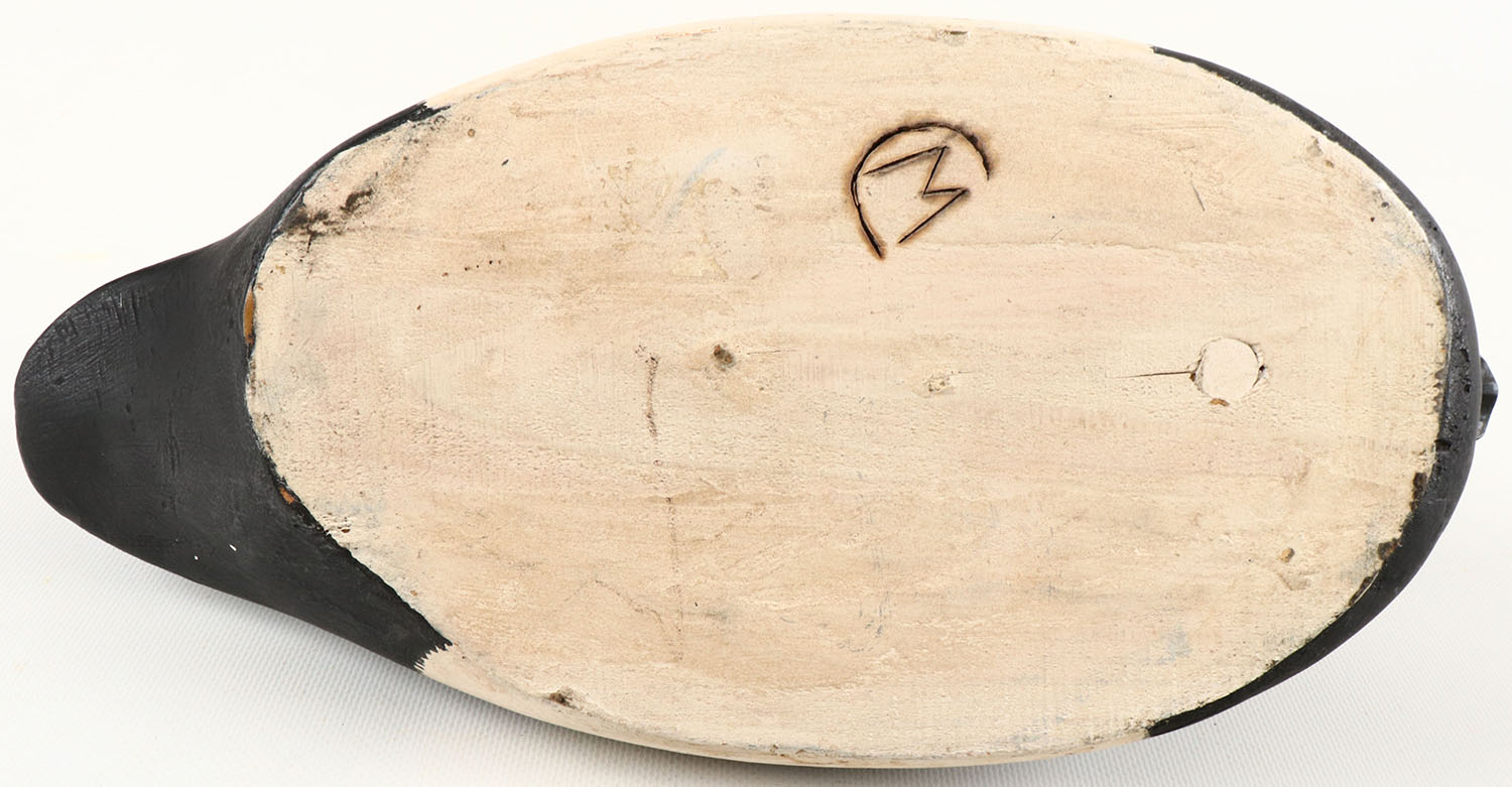 Redhead Drake by Maynard Caine, Ontario, Canada, glass eyes, structurally excellent, solid wood, excellent original comb painting, excellent original paint, has branded M on bottom. Grade: Excellent ++ - Value: 50 to 150