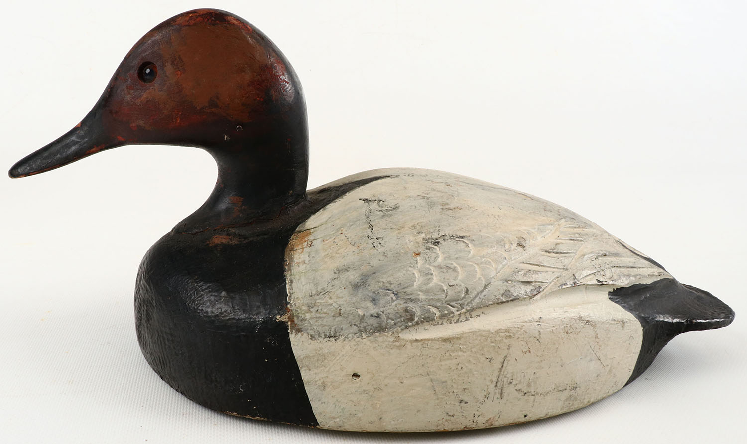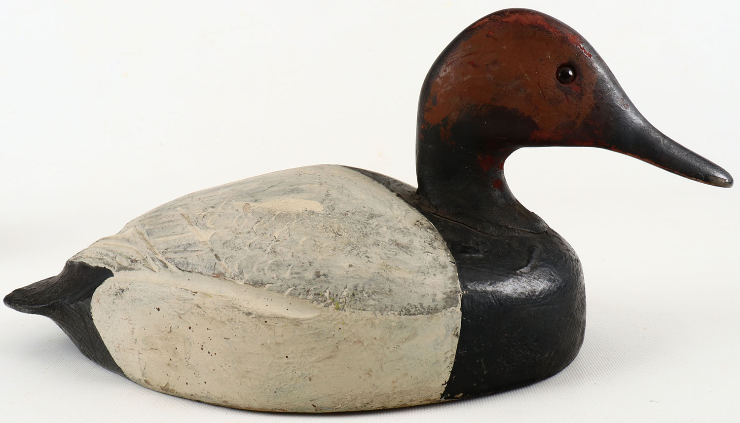 Canvasback Drake by unknown maker, glass eyes, structurally excellent, solid wood, excellent original paint. Grade: Very Good ++ - Value: 20 to 100