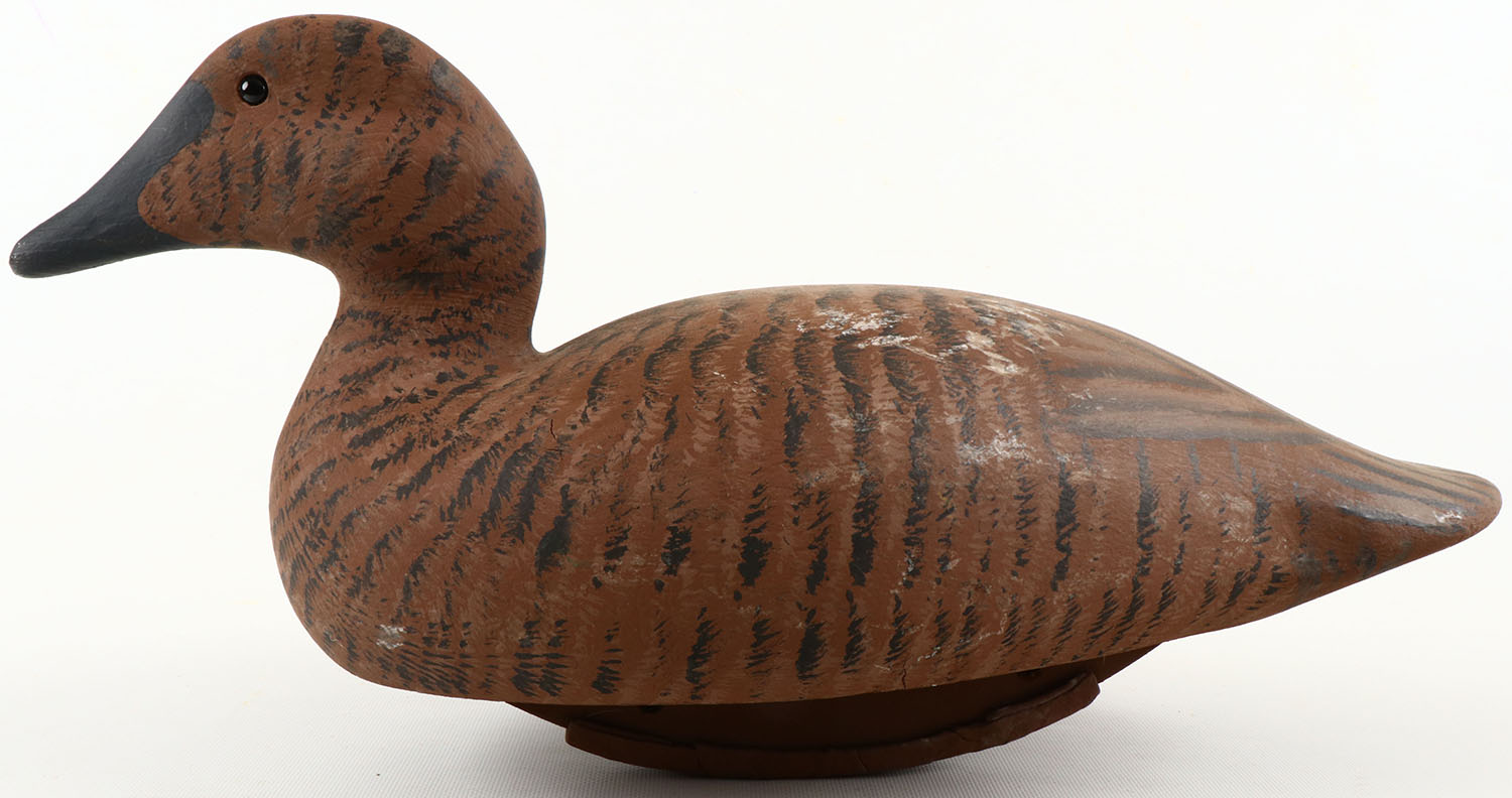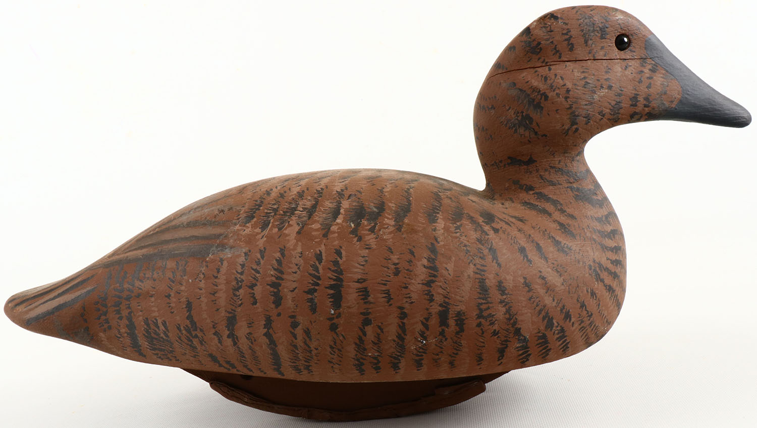 Common Eider Hen by unknown maker, MD, glass eyes, structurally excellent, solid wood, excellent original paint, branded BDW on bottom. Grade: MINT - Value: 20 to 100