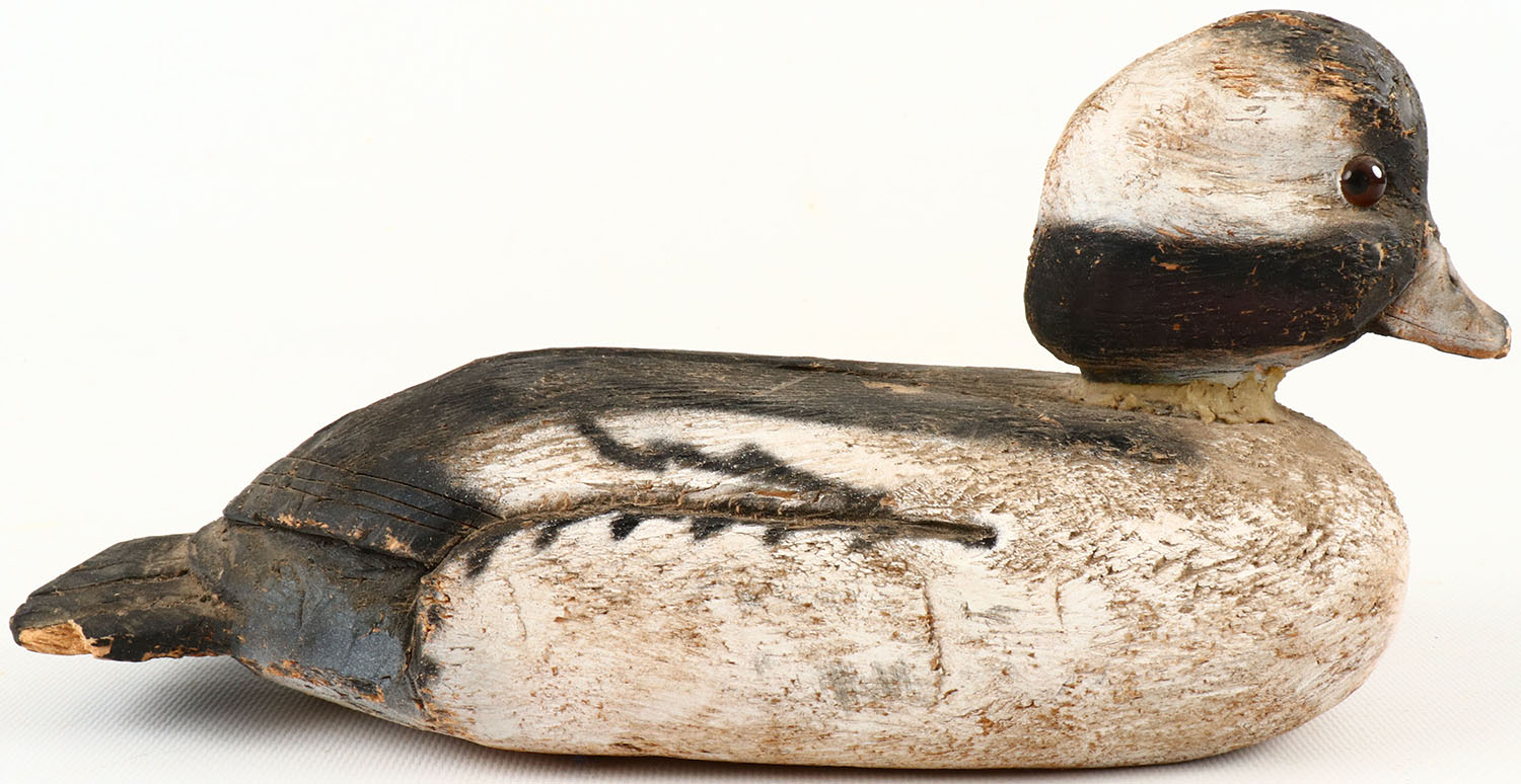Bufflehead Drake by unknown maker, glass eyes, structurally excellent, solid bass wood, excellent original paint with typical wear. Grade: Very Good + - Value: 20 to 100