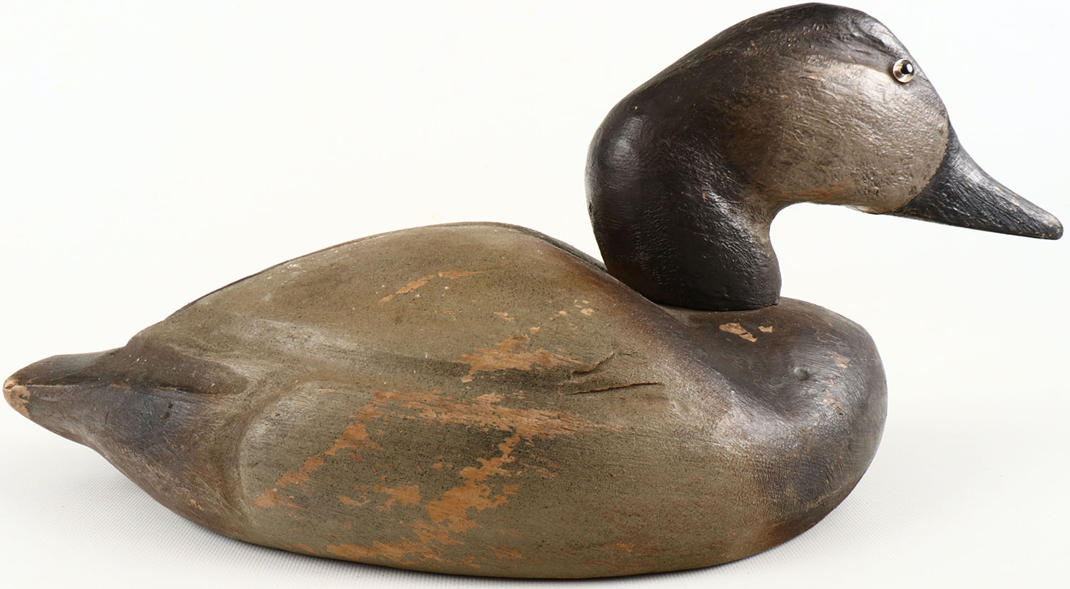 Canvasback Hen by Animal Trap Company, Pascagoula, MS, glass eyes, structurally excellent, solid wood, neck is loose, excellent original paint with typical wear, stamped on bottom. Grade: Excellent - Value: 40 to 150