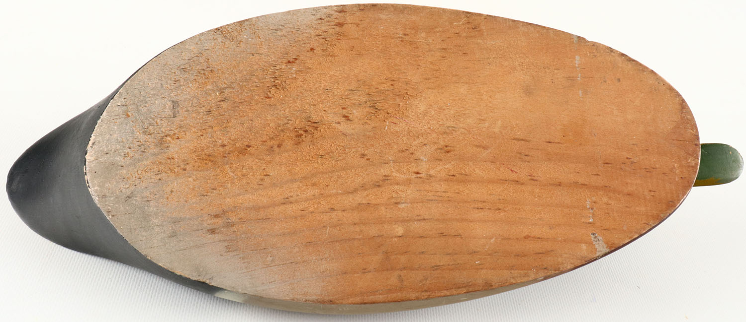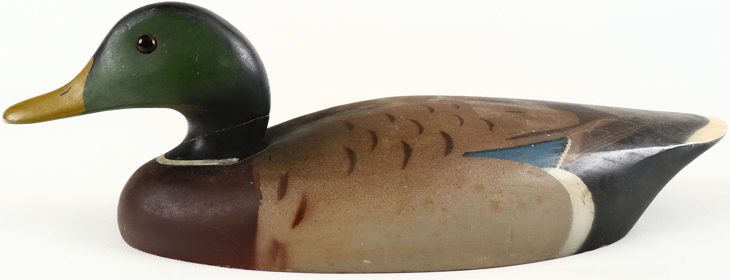 Mallard Drake by Wildfowler, glass eyes, has crack through midway of neck, solid wood, excellent original paint. Grade: Very Good ++ - Value: 40 to 150