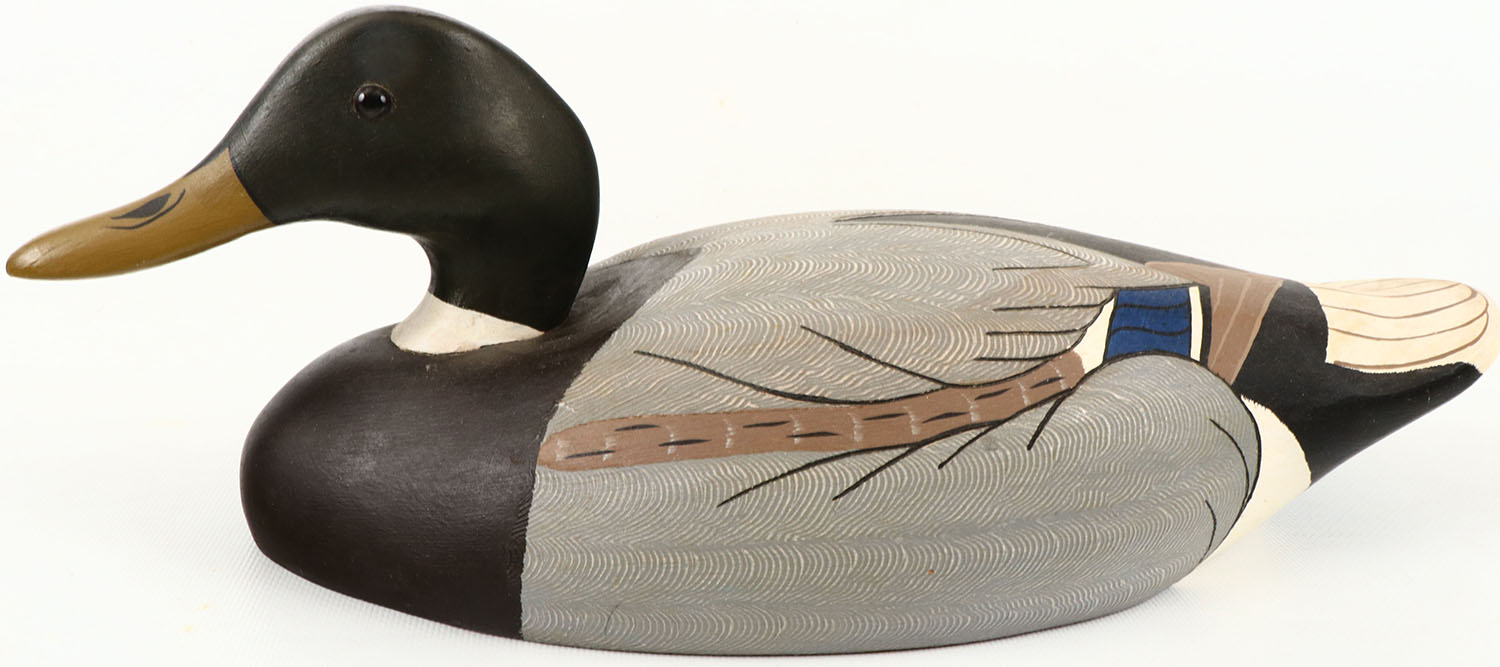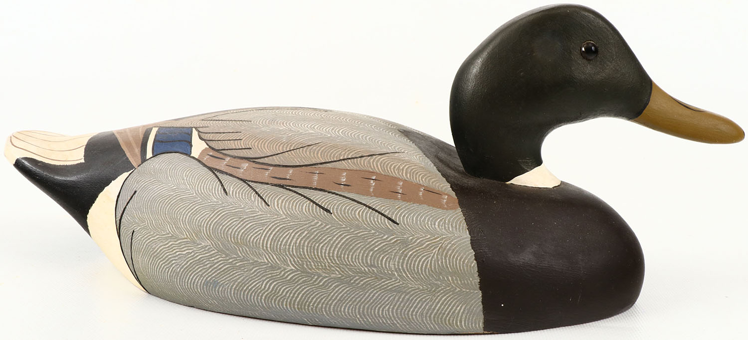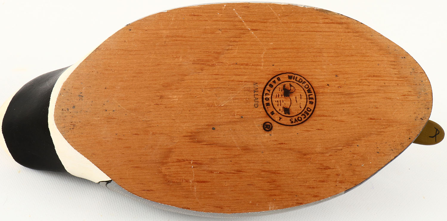 Mallard Drake by Wildfowler Decoys, Babylon, N.Y. glass eyes, structurally excellent, solid wood, mint original paint, excellent original comb painting. Grade: MINT - Value: 40 to 150