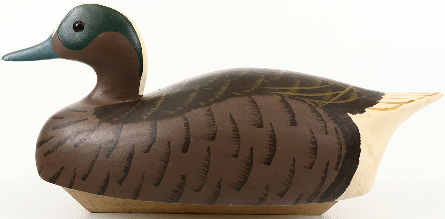Widgeon Drake, Wildfowler Decoys Inc, Bohemia, N.Y, glass eyes, structurally excellent, hollow wood, mint original paint. Grade: MINT - Value: 40 to 150
