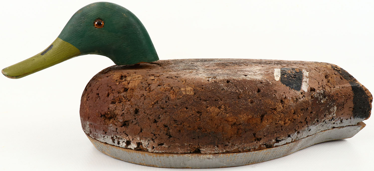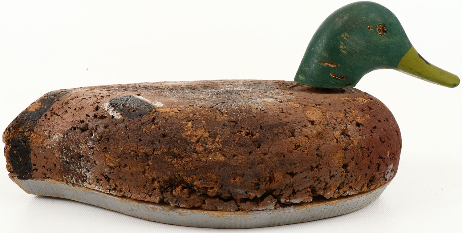 Mallard Drake by unknown maker, glass eyes with one eye missing, structurally excellent, cork body with wood bottom, excellent original paint. Grade: Excellent - Value: 10 to 100