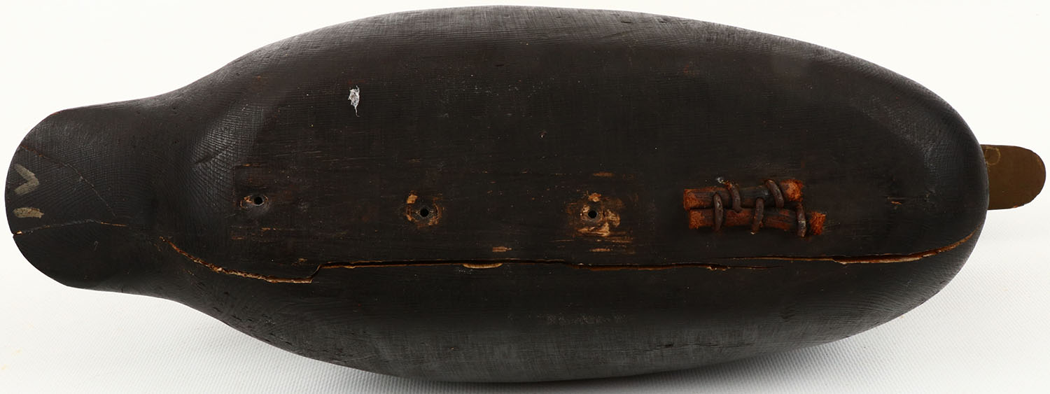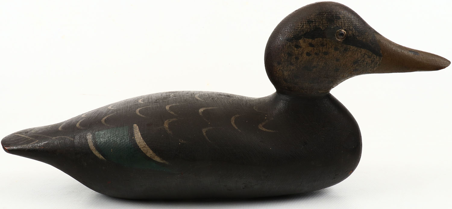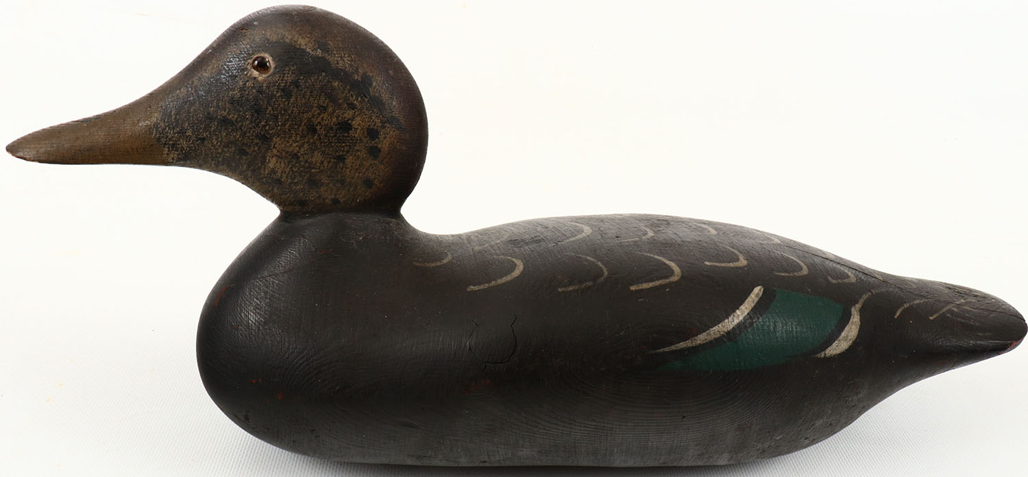 Black Duck by Mason Decoy Company 1896-1924, glass eyes, solid wood, original paint with typical wear, has age crack on bottom. Grade: Excellent - Value: 200 to 400