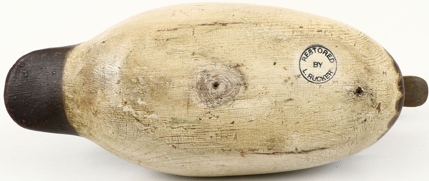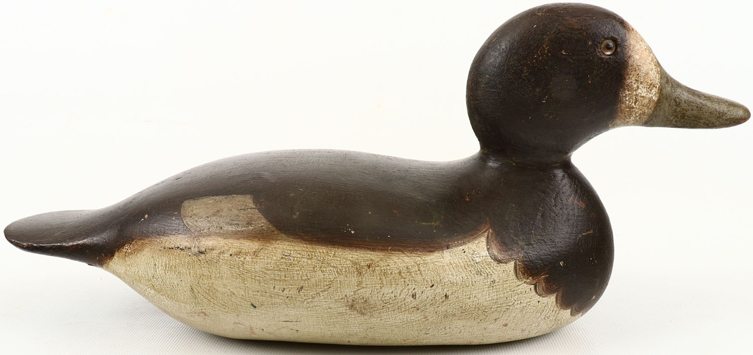 Bluebill Hen by Mason Decoy Co., 1896-1924, restored by Larry Rucker, glass eyes, structurally excellent, solid wood, excellent original paint with typical wear. Grade: Excellent - Value: 50 to 150