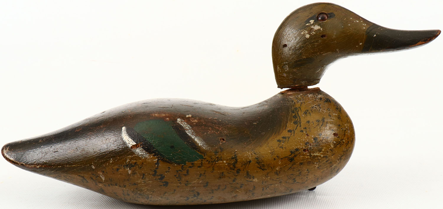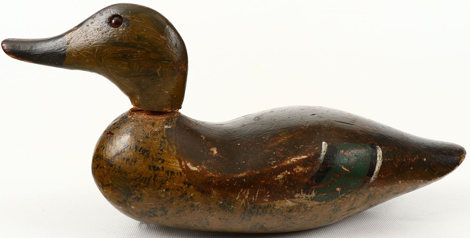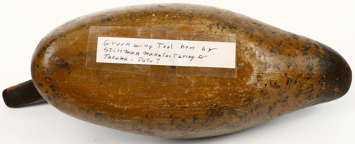 Green-wing Teal Hen by Stillman Manufacturing Com, Tacoma, glass eyes, structurally excellent, solid wood, original paint with typical wear, head is loose. Grade: Very Good ++ - Value: 100 to 300