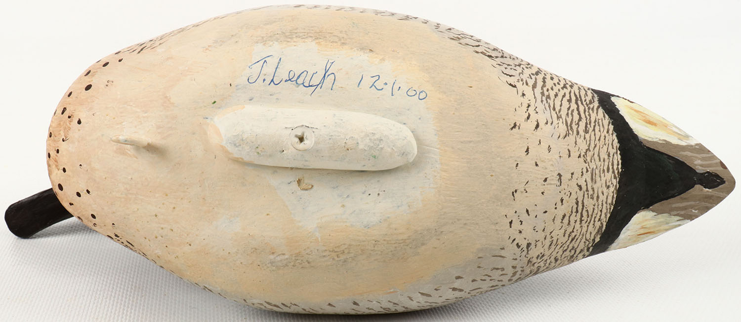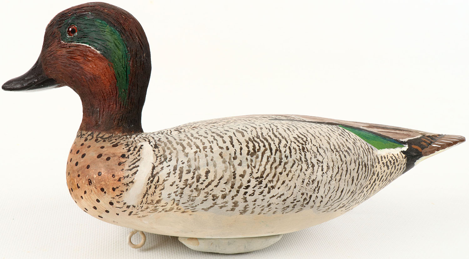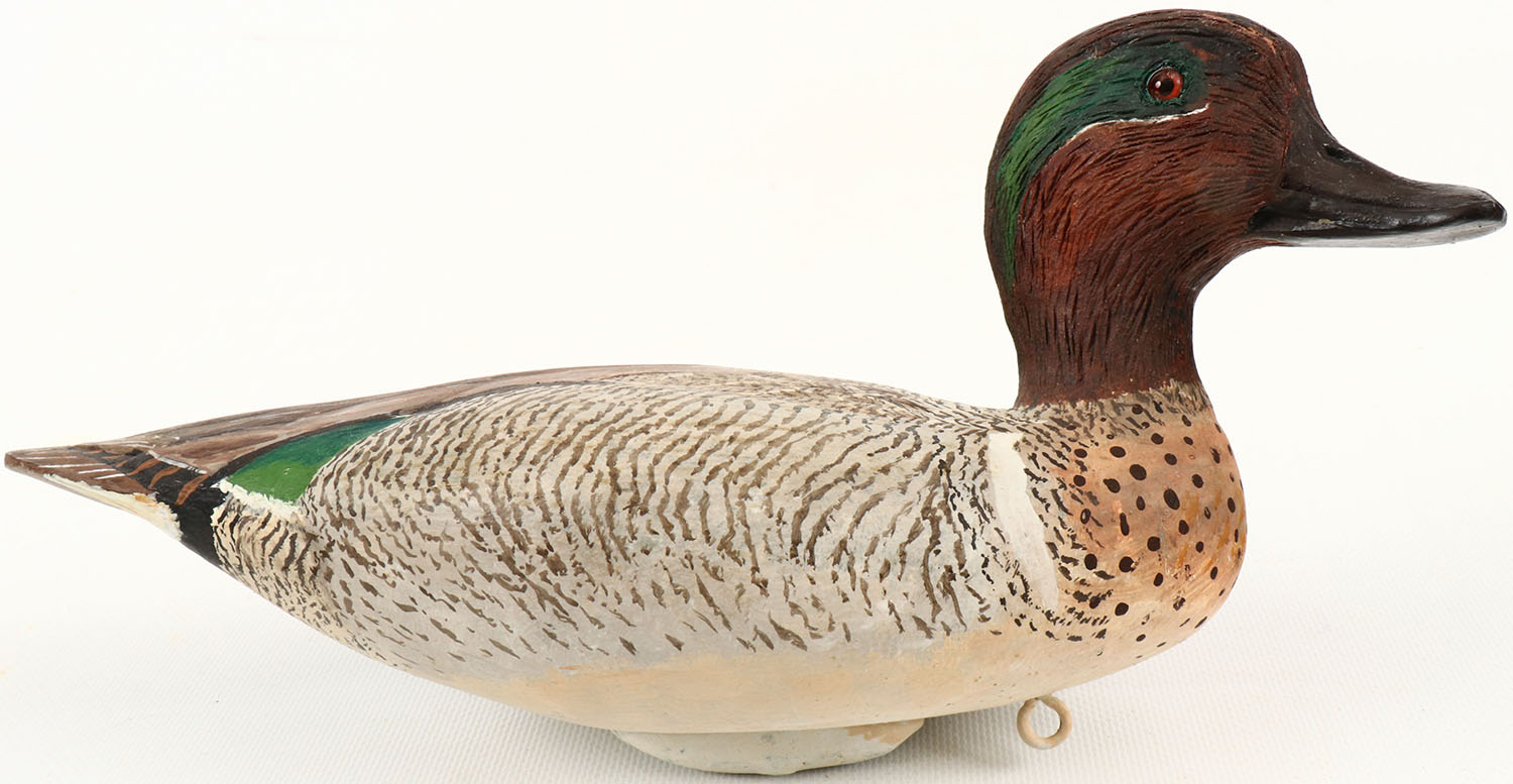 Green-wing Teal Drake by Jack Leach, Tacoma, WA., glass eyes, structurally excellent, hollow wood, excellent original paint with feather detail, signed on bottom. Grade: MINT - Value: 100 to 200