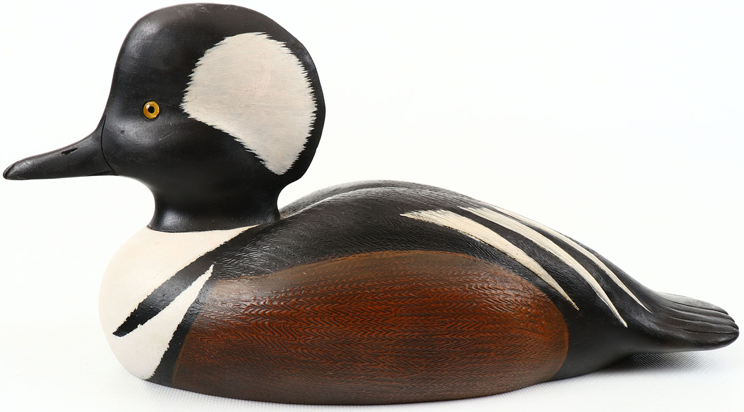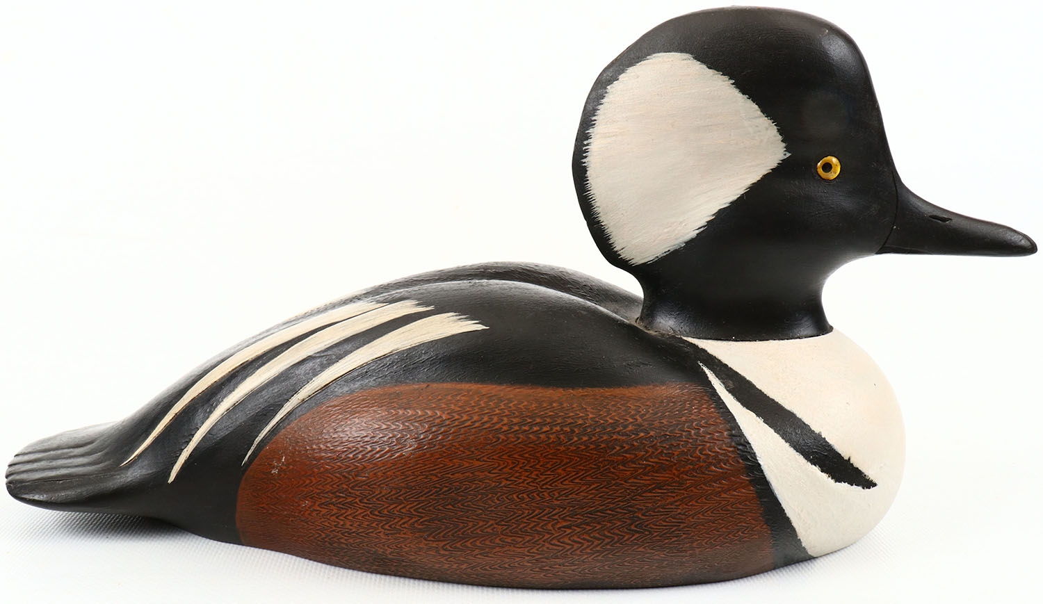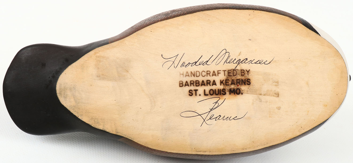 Hooded Merganser by Barbara Kerns, ST. Louis MO. glass eyes, structurally excellent, solid wood, excellent original paint, signed and branded on bottom. Grade: MINT - Value: 50 to 100