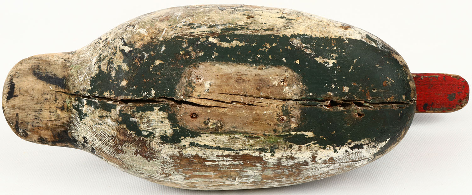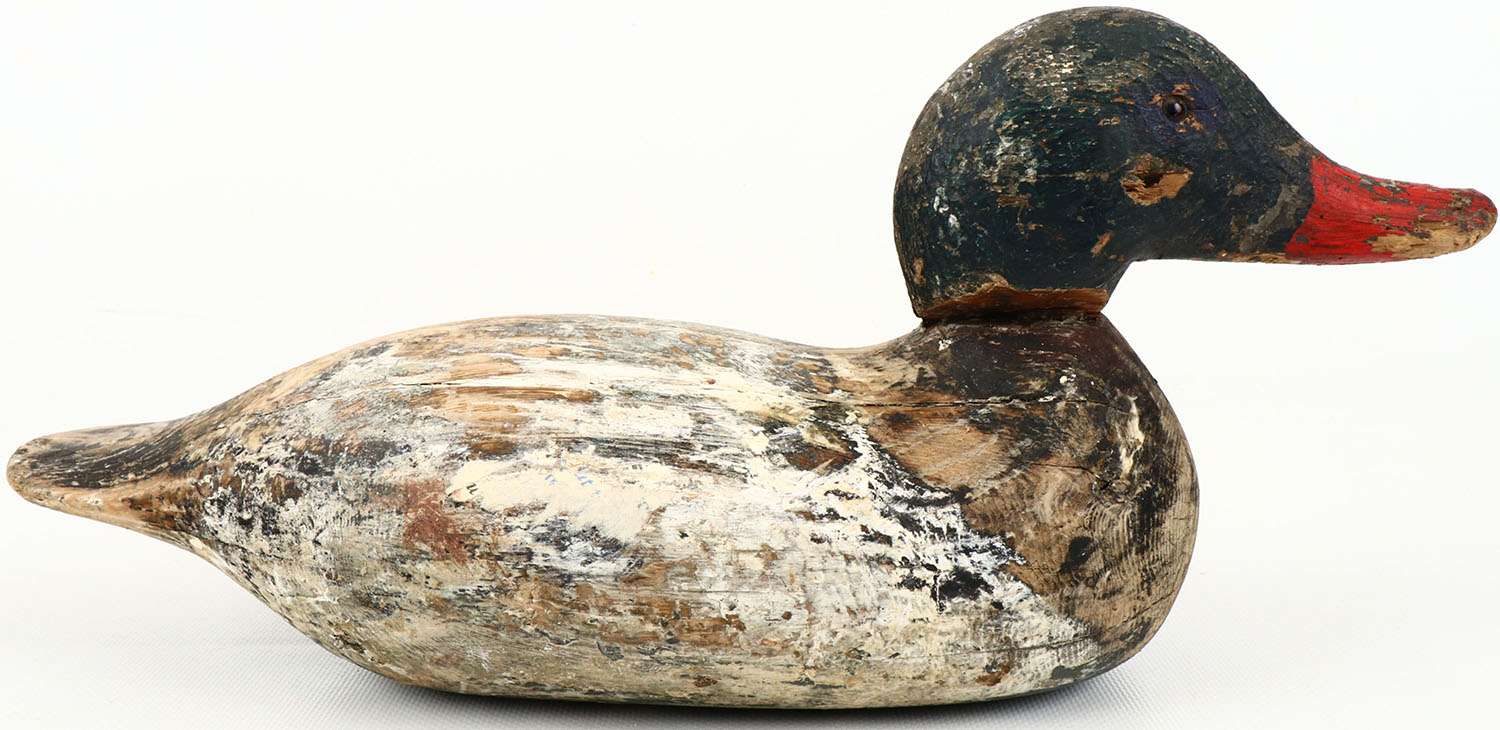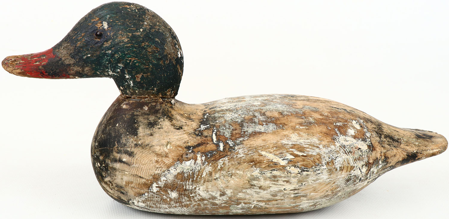 Mallard Drake by unknown maker, glass eyes, solid wood, head is loose, original paint with typical wear. Grade: Good - Value: 20 to 40