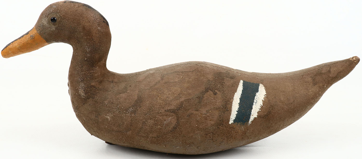 Mallard Hen by Scott Cork Decoy Company, CA, canvas over cork, tack eyes, original paint with typical wear. Grade: Excellent - Value: 40 to 150