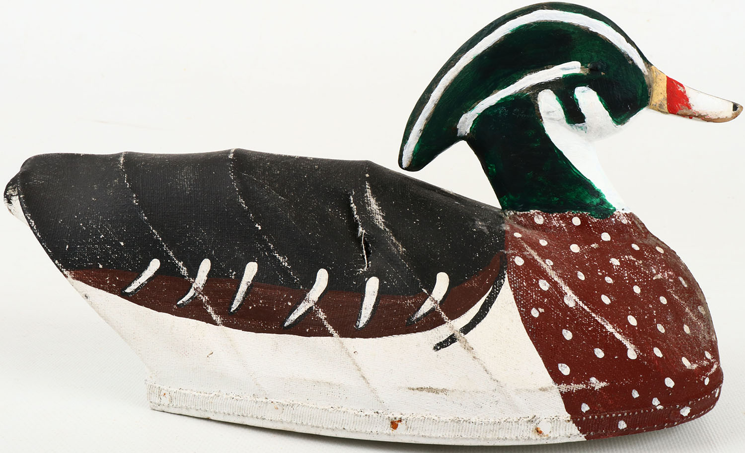 Woodduck Drake by unknown maker, NC, glass eyes, wood head, canvas over wire body, excellent original paint, branded W.M. on bottom. Grade: Excellent - Value: 20 to 40