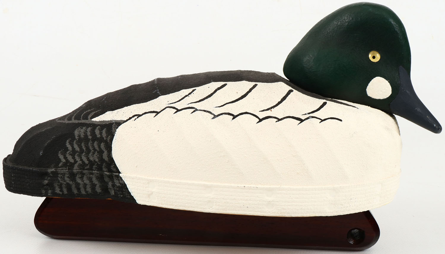 Goldeneye Drake by C.J., glass eyes, structurally excellent, wood head, canvas over wire body, excellent original paint, branded CJ on bottom. Grade: MINT - Value: 20 to 60