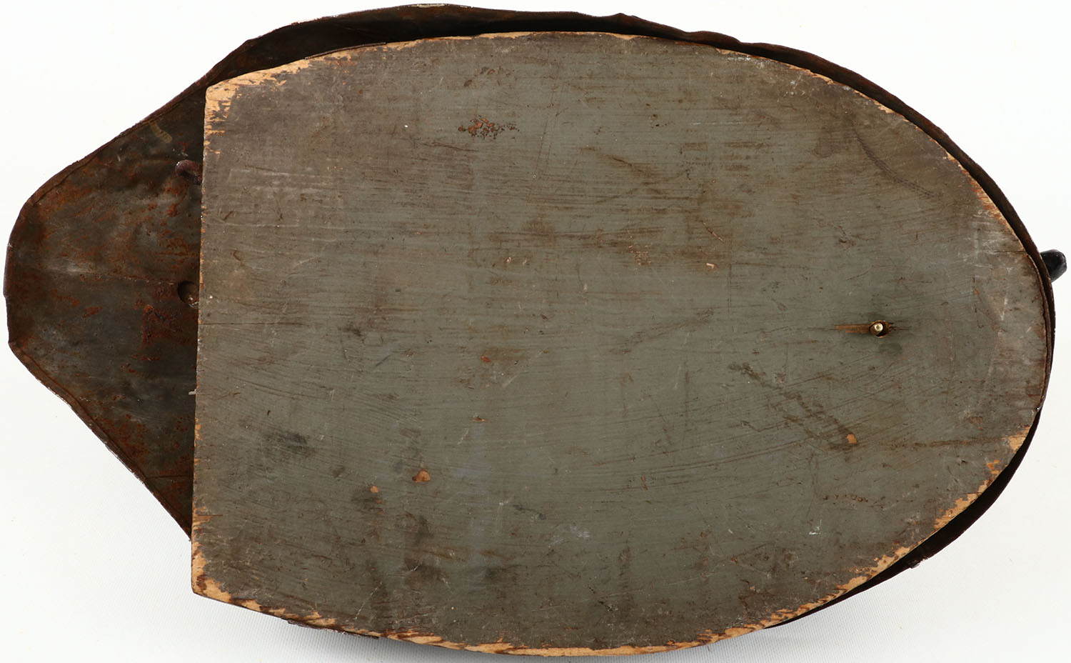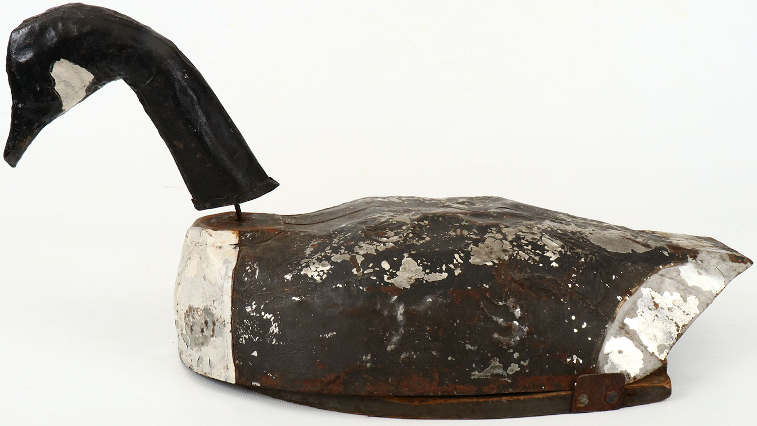 Canada Goose by unknown maker, no eyes, metal body, wood base, base is not attached to body and head is loose, original paint with lots of wear. Grade: Very Good ++ - Value: 20 to 60