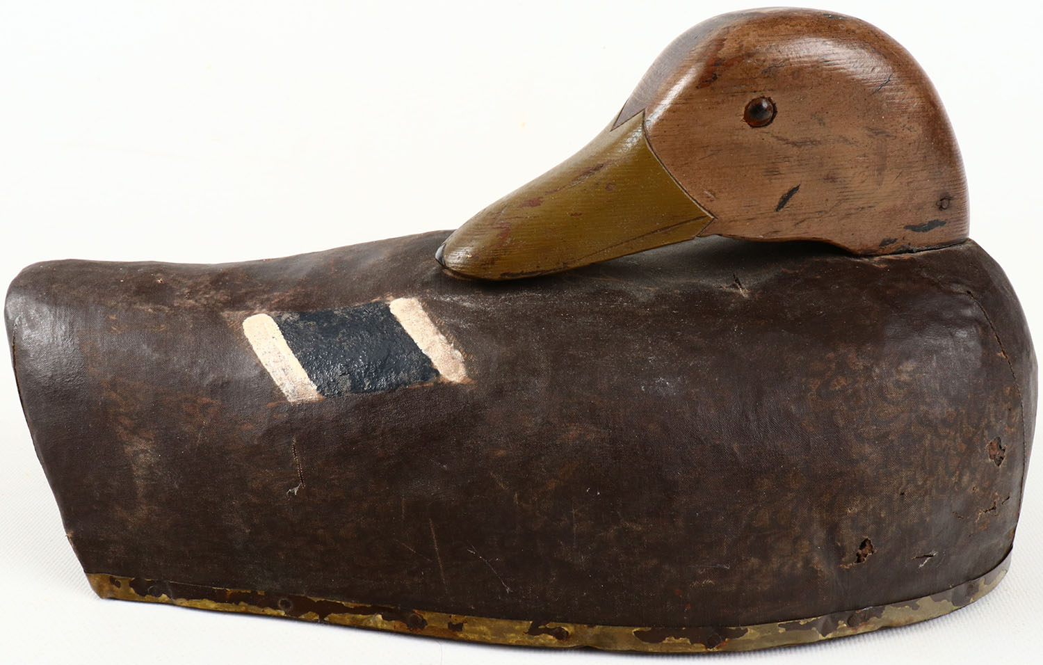Sleeper Mallard Hen by Herters Inc., canvas over cork, glass eyes, original paint, structurally excellent, has rare early metal bottom band. Grade: Excellent - Value: 50 to 150