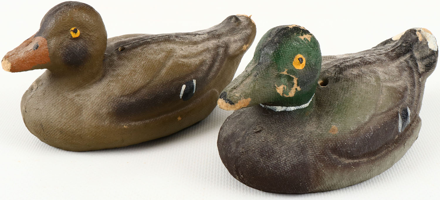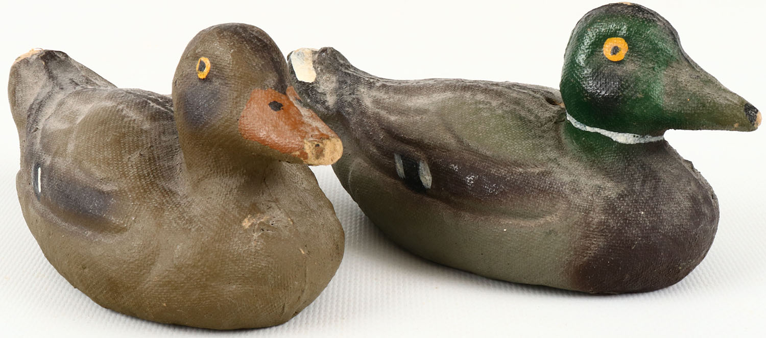 SALESMAN SAMPLE Pair of Mallards by Carry-Lite Decoys, Milwaukee, Wis., well marked, PE, paper mache', original paint shows light wear. Grade: Excellent - Value: 20 to 50