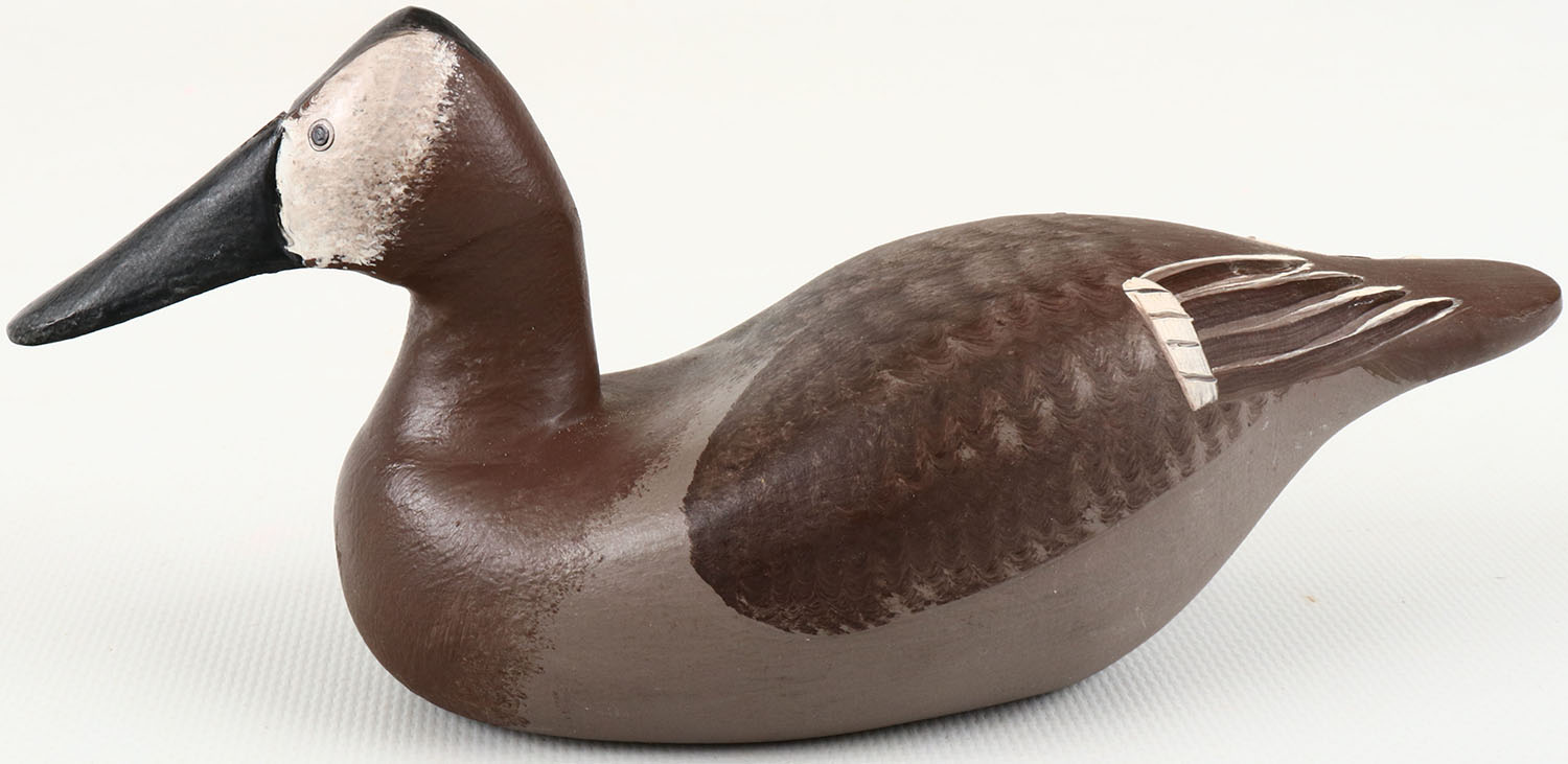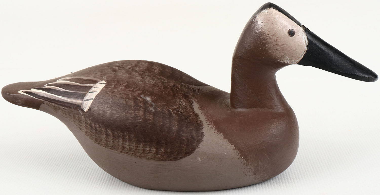 Miniature Canvasback Hen by Clarence Bauer, Havre de Grace, MD., painted eyes, structurally excellent, solid wood, excellent original paint. Grade: MINT - Value: 10 to 30