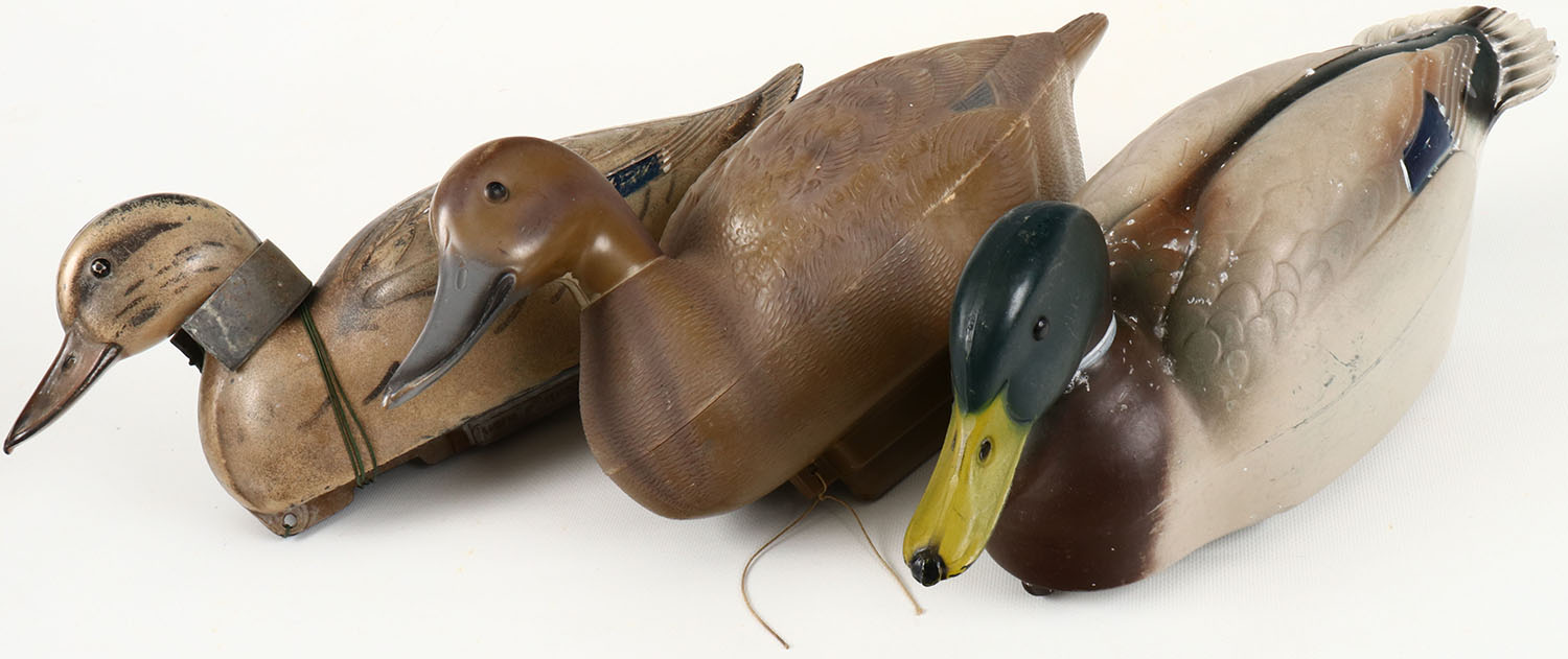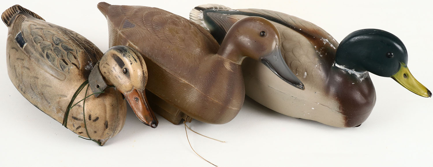 Lot of 3 (1) Plastic Mallard Drakes & (2) Hens by unknown maker, original paint. Grade: Very Good - Value: 2 to 30