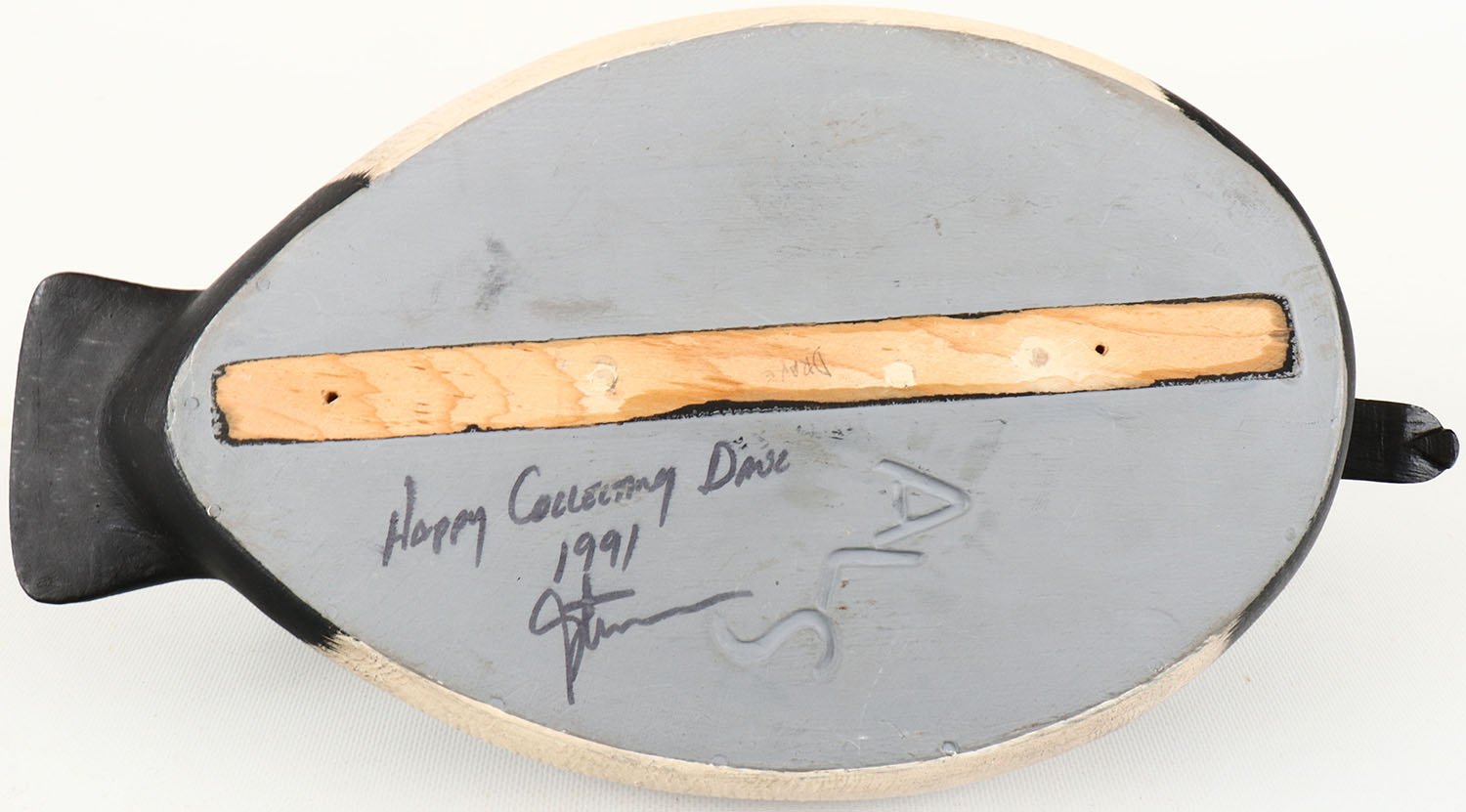 Canvasback Drake by ALS, glass eyes, structurally excellent, hollow wood, excellent original paint with excellent original comb painting, signed on bottom, branded ALS on bottom. Grade: Excellent - Value: 50 to 150