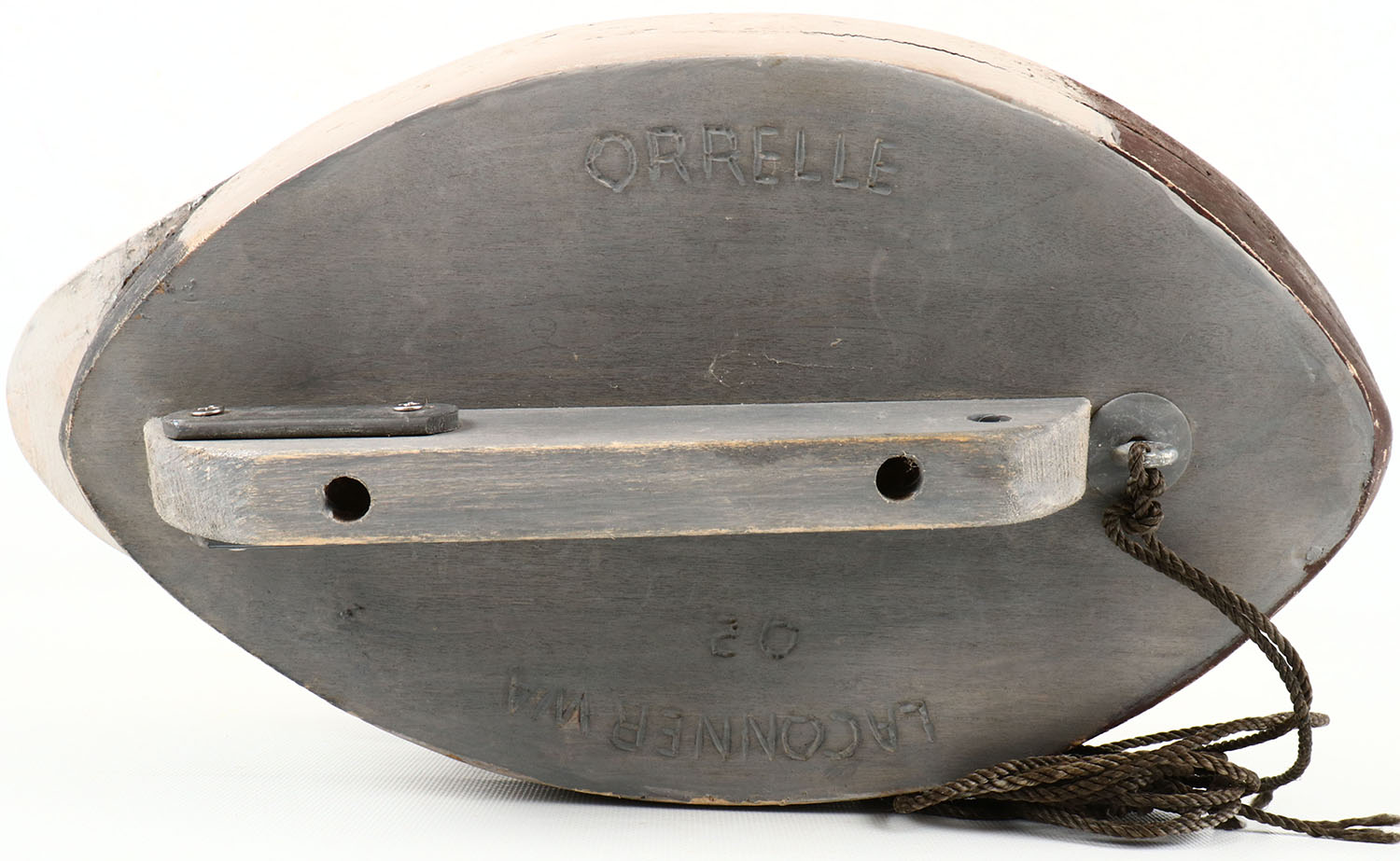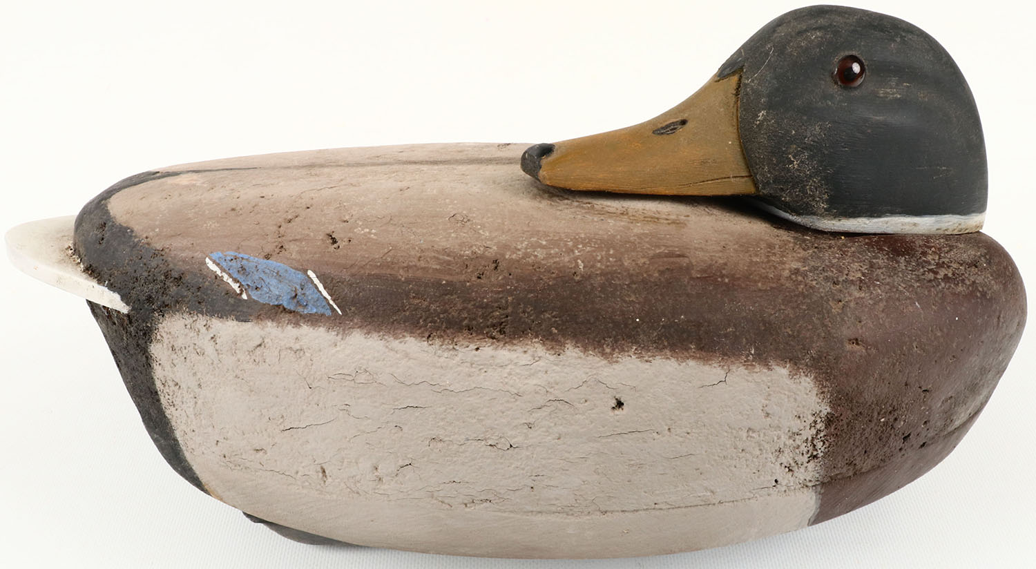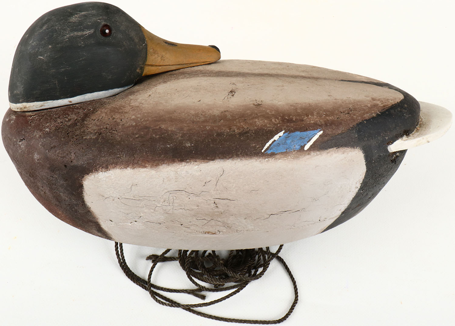 Preening Mallard Drake by John Orrelle, LaConner WA., glass eyes, solid cork with wood bottom board, original paint, stamped on bottom. Grade: Excellent - Value: 50 to 150