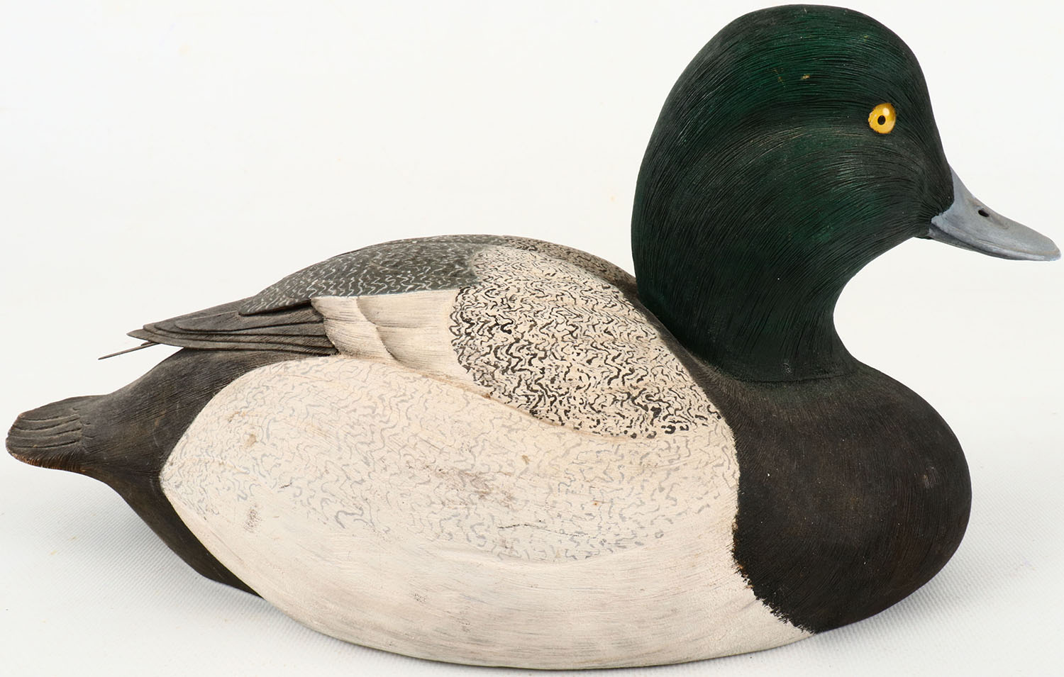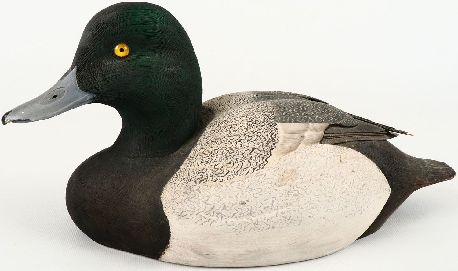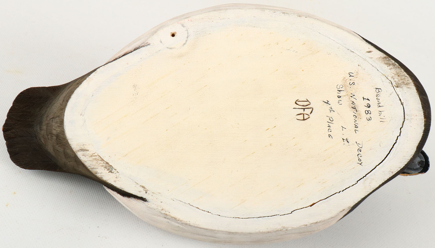 Bluebill Drake by DFA (1983), U.S. National Decoy Show 4th Place, glass eyes, hollow wood, has chip in bill, original paint, branded DFA on bottom, signed on bottom. Grade: Very Good + - Value: 250 to 500