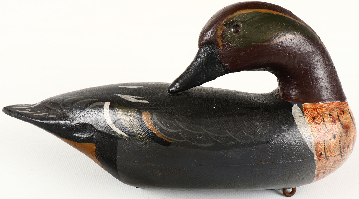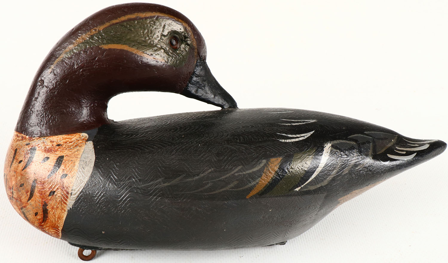 Preening Green Wing Teal Drake by Henry Perdew Style, attributed to Charlie Moore, glass eyes, structurally excellent, hollow wood, excellent original paint with original comb painting. Grade: MINT - Value: 50 to 150