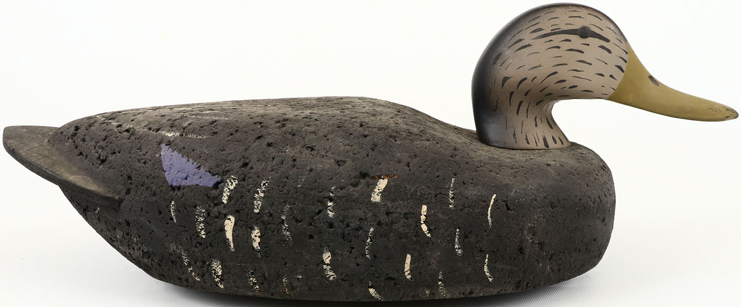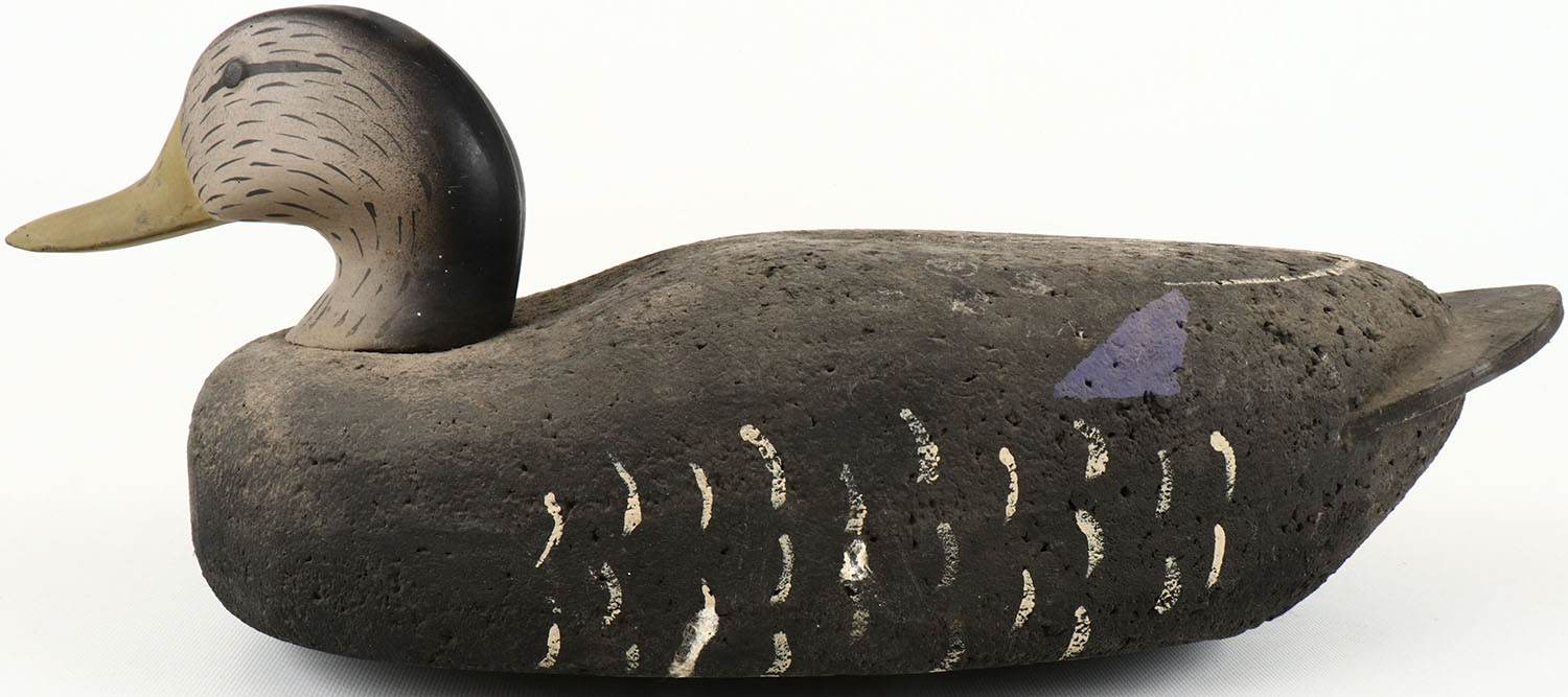 Black Duck by Herters, TE, painted eyes, solid cork body, original paint, branded MLB Decoy. Grade: Excellent + - Value: 20 to 60
