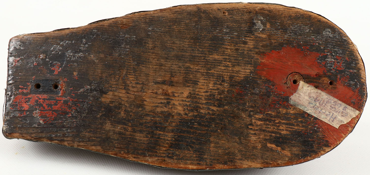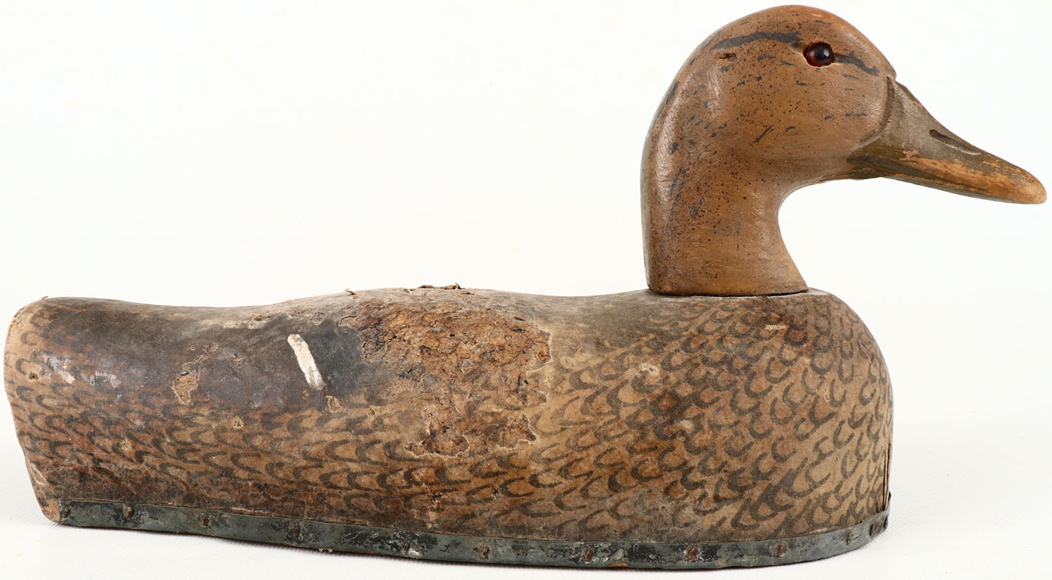 Mallard Hen by Herters Inc., canvas over cork, glass eyes, original paint, has tears to top of back with scuffing, structurally excellent, has rare early metal bottom band. Grade: Very Good - Value: 80 to 200