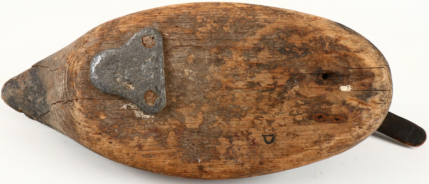 High neck Canvasback Drake by unknown, TE, solid wood, paint is mostly worn off, crack to head. Grade: Good ++ - Value: 30 to 50
