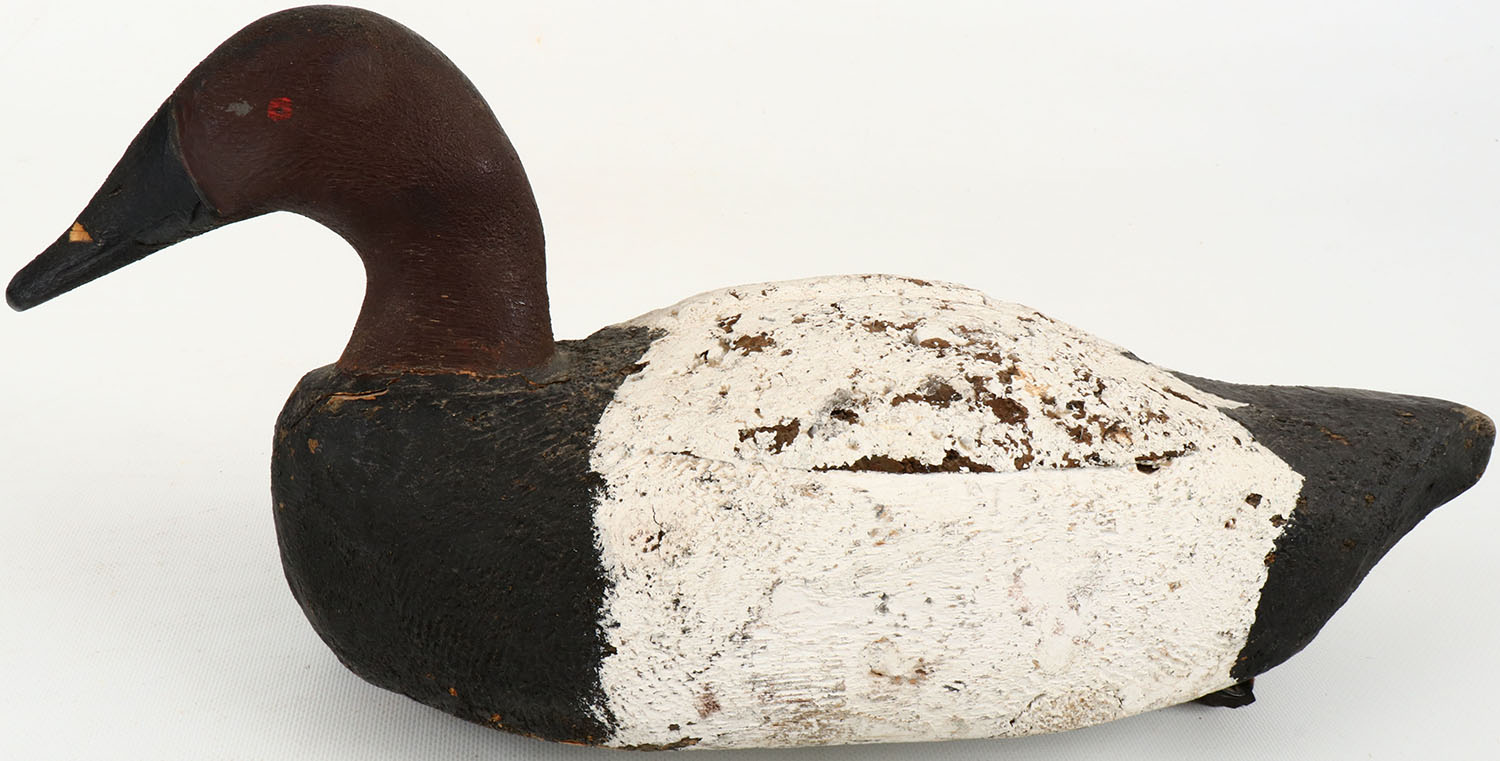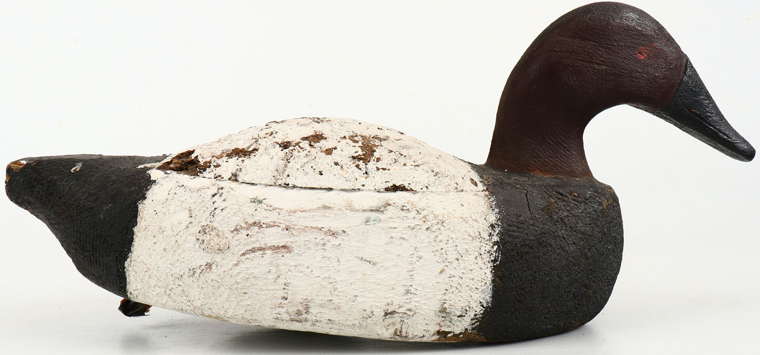 Canvasback Drake by unknown, PE, solid wood with cork back, original paint, hair line crack to neck, chip to bill. Grade: Very Good ++ - Value: 30 to 60