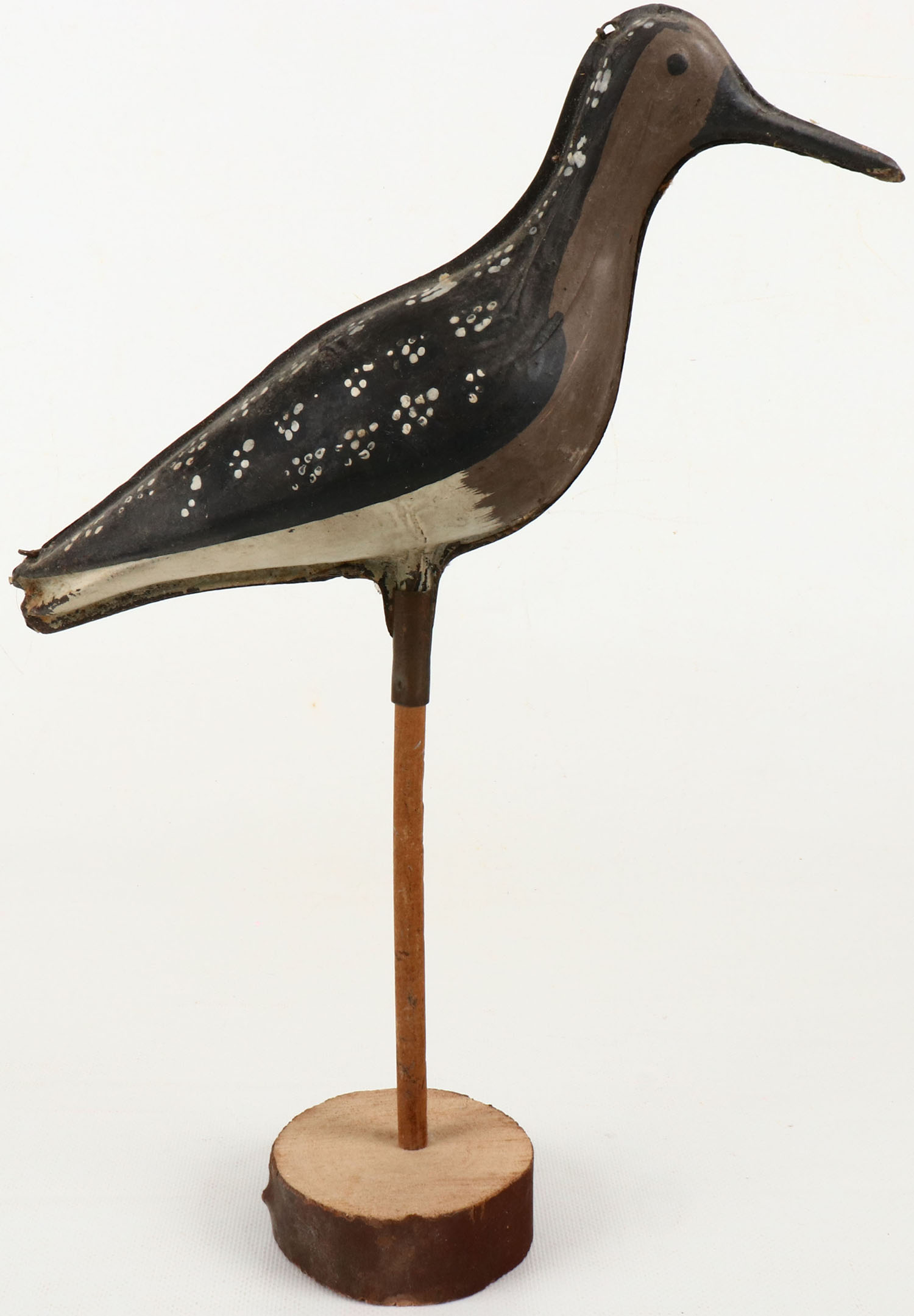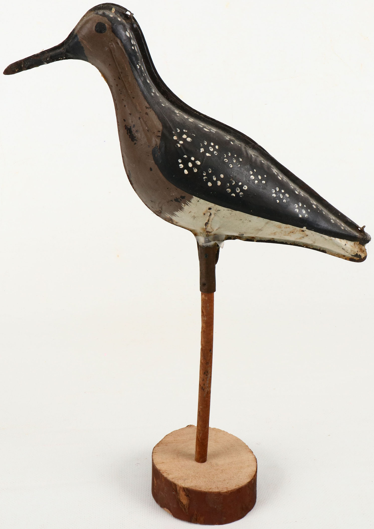 Metal 2pc. Yellowlegs, Shorebird by Strater & Sohier, Boston MA, painted eyes, with wire hinges, dowel with base, original paint, 10'' OAL. Grade: Excellent - Value: 100 to 200