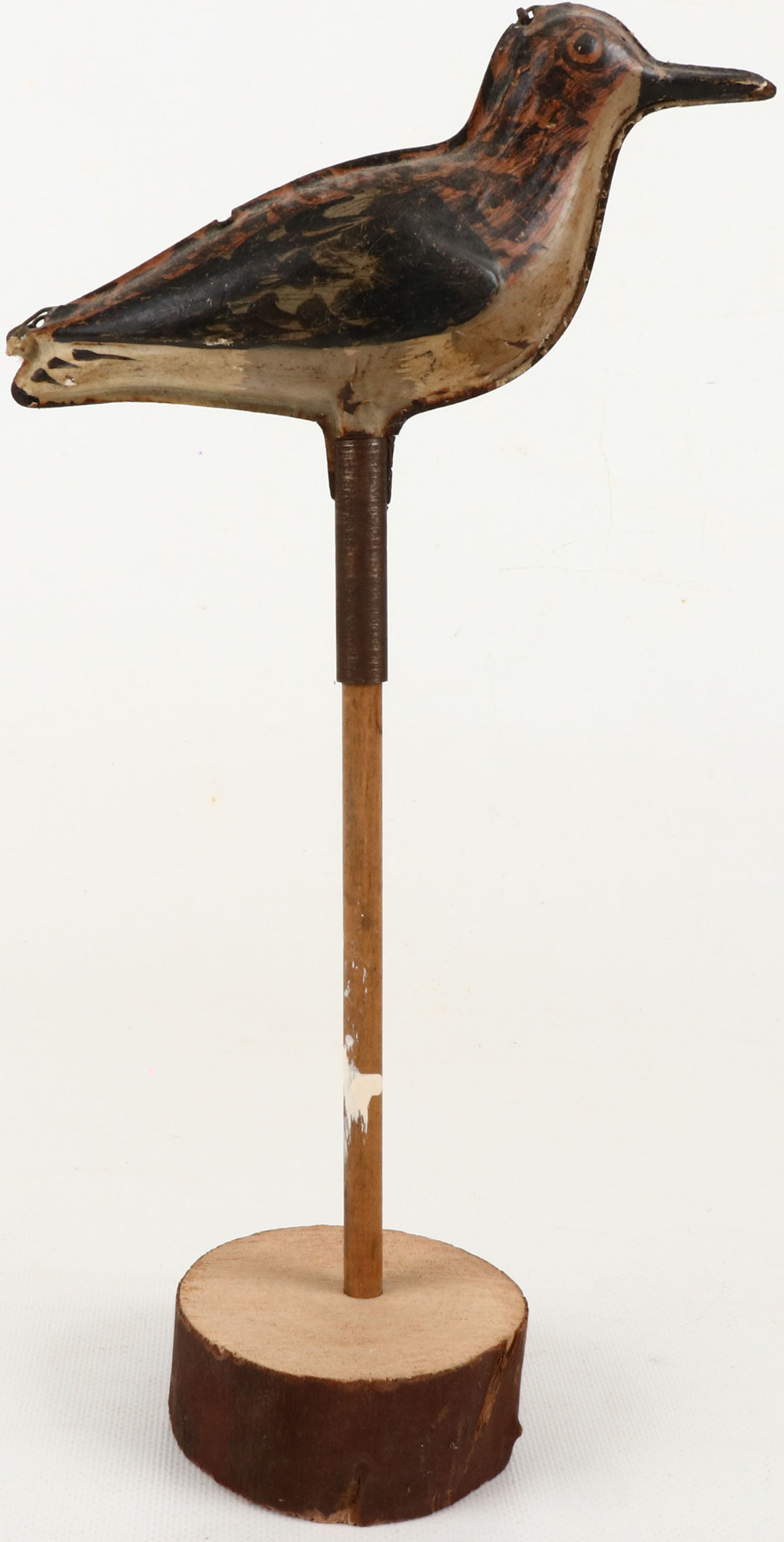 Metal 2pc. Peep, Shorebird by Strater & Sohier, Boston MA, painted eyes, with wire hinges, dowel with base, original paint, 7'' OAL. Grade: Excellent - Value: 150 to 300