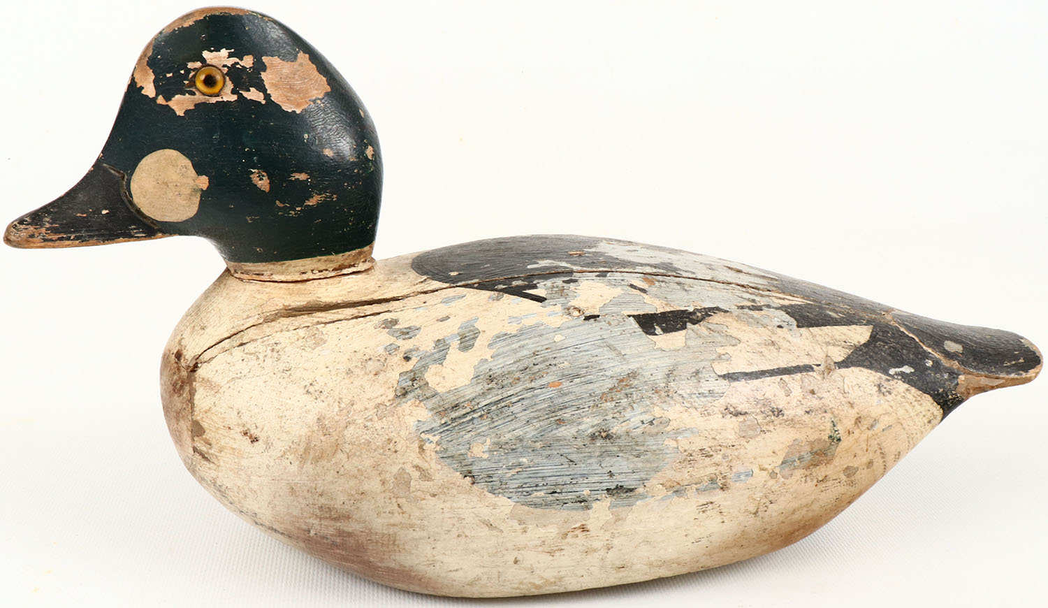 Goldeneye Drake by unknown, GE, solid wood, original paint shows wear, large chip repair to tail & age crack to back, head is loose on dowel. Grade: Very Good - Value: 50 to 150