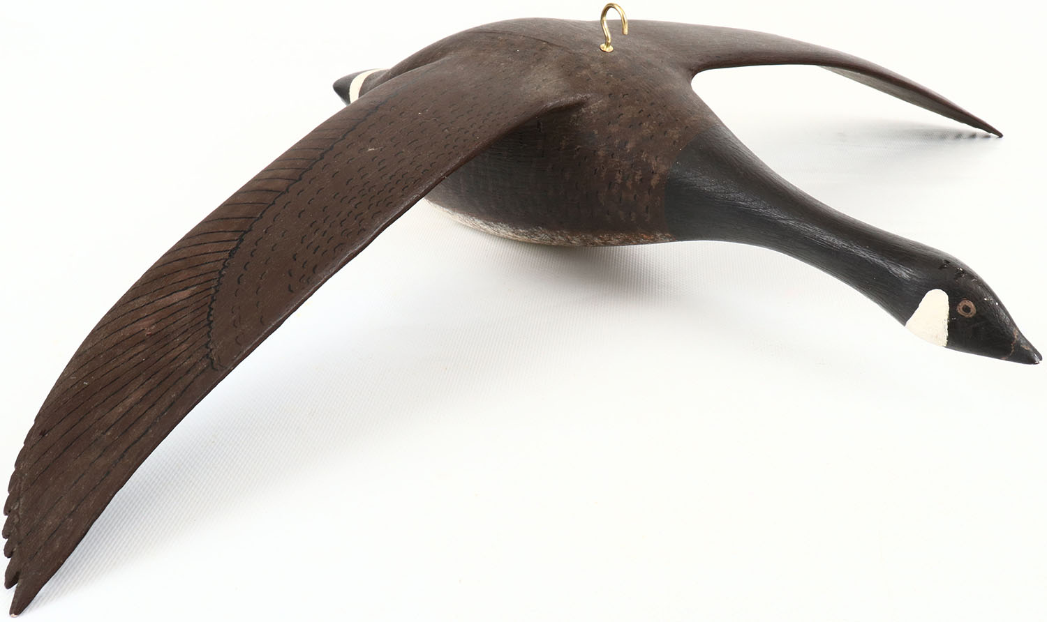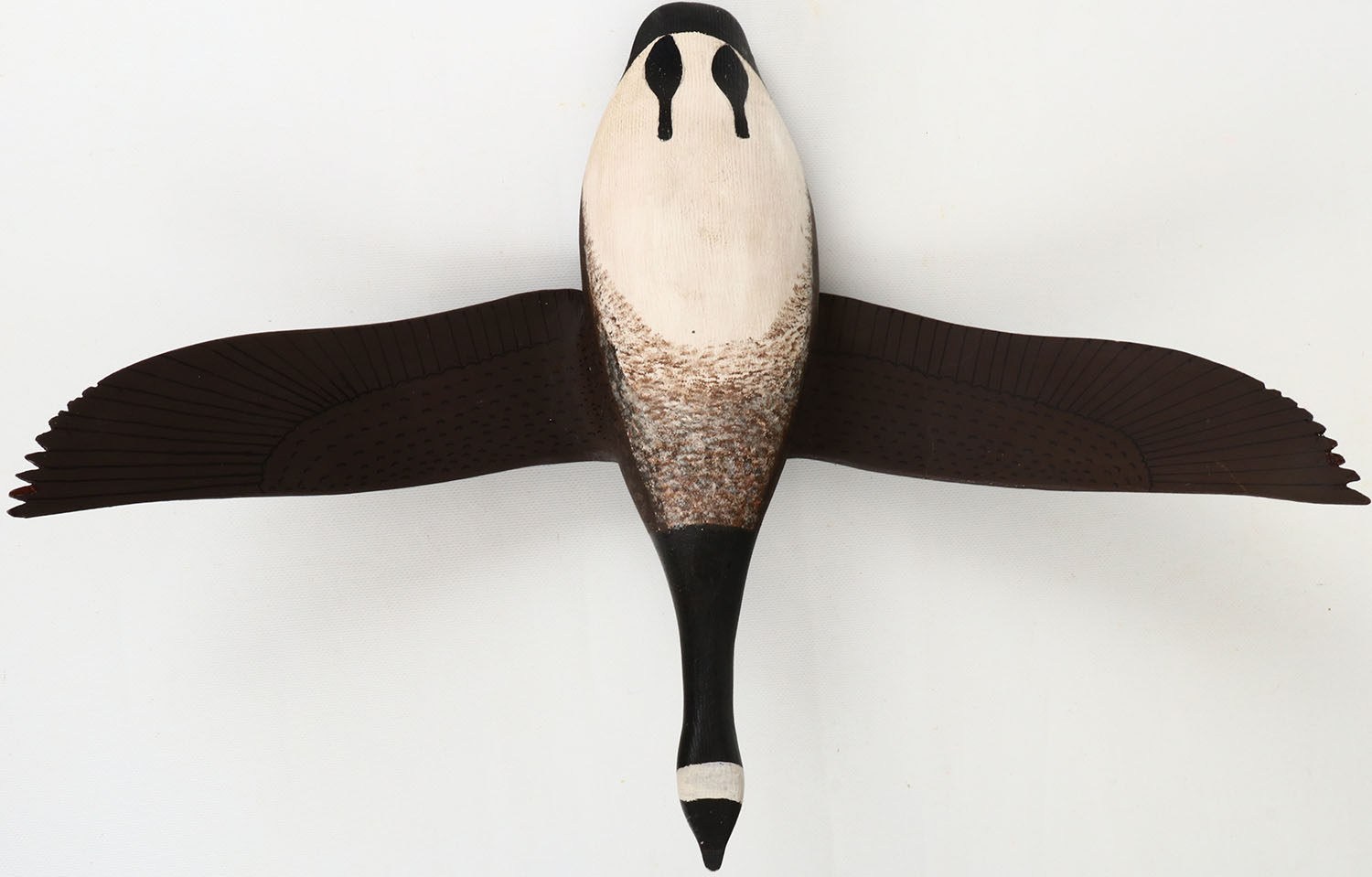 Flying Brant by Bob Pike, Oak Harbor WA., painted eyes, structurally excellent, hollow wood, mint original paint with feather detail 16'' IN OAL, very minor chips on wings. Grade: Excellent ++ - Value: 50 to 150