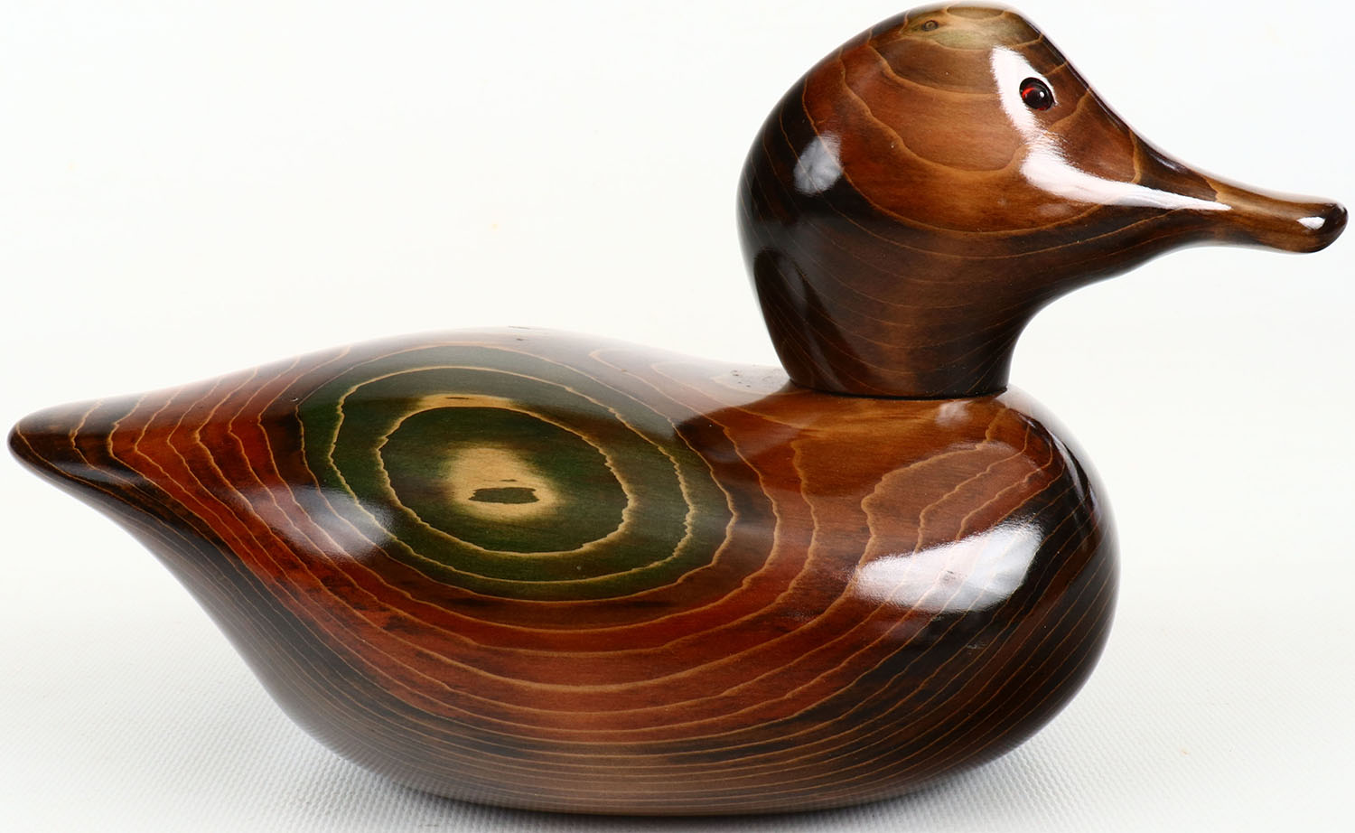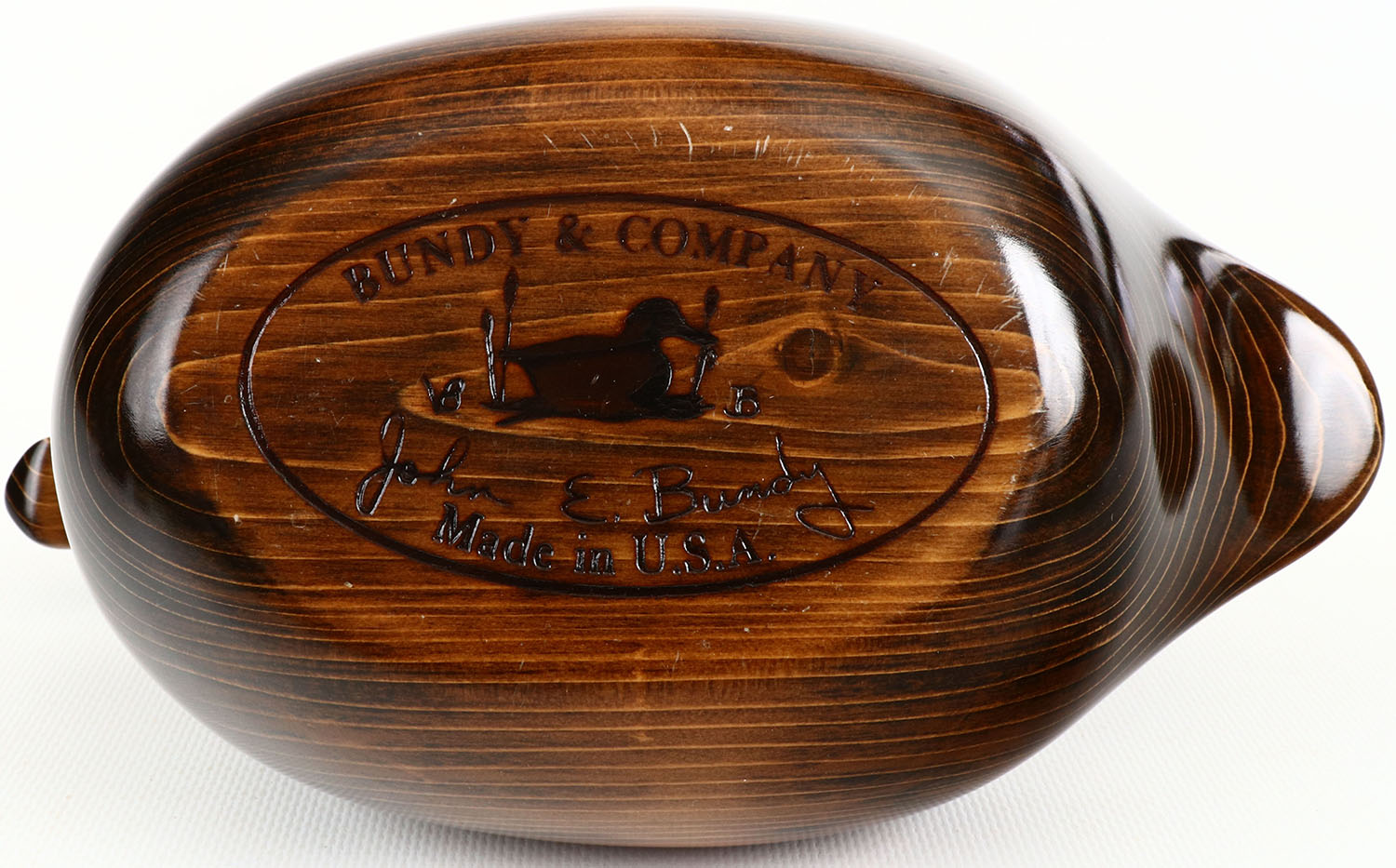Buffelhead Decoy By Bundy & Company, John E. Bundy, glass eyes, solid wood, mint original stain and finish. Grade: MINT - Value: 10 to 30