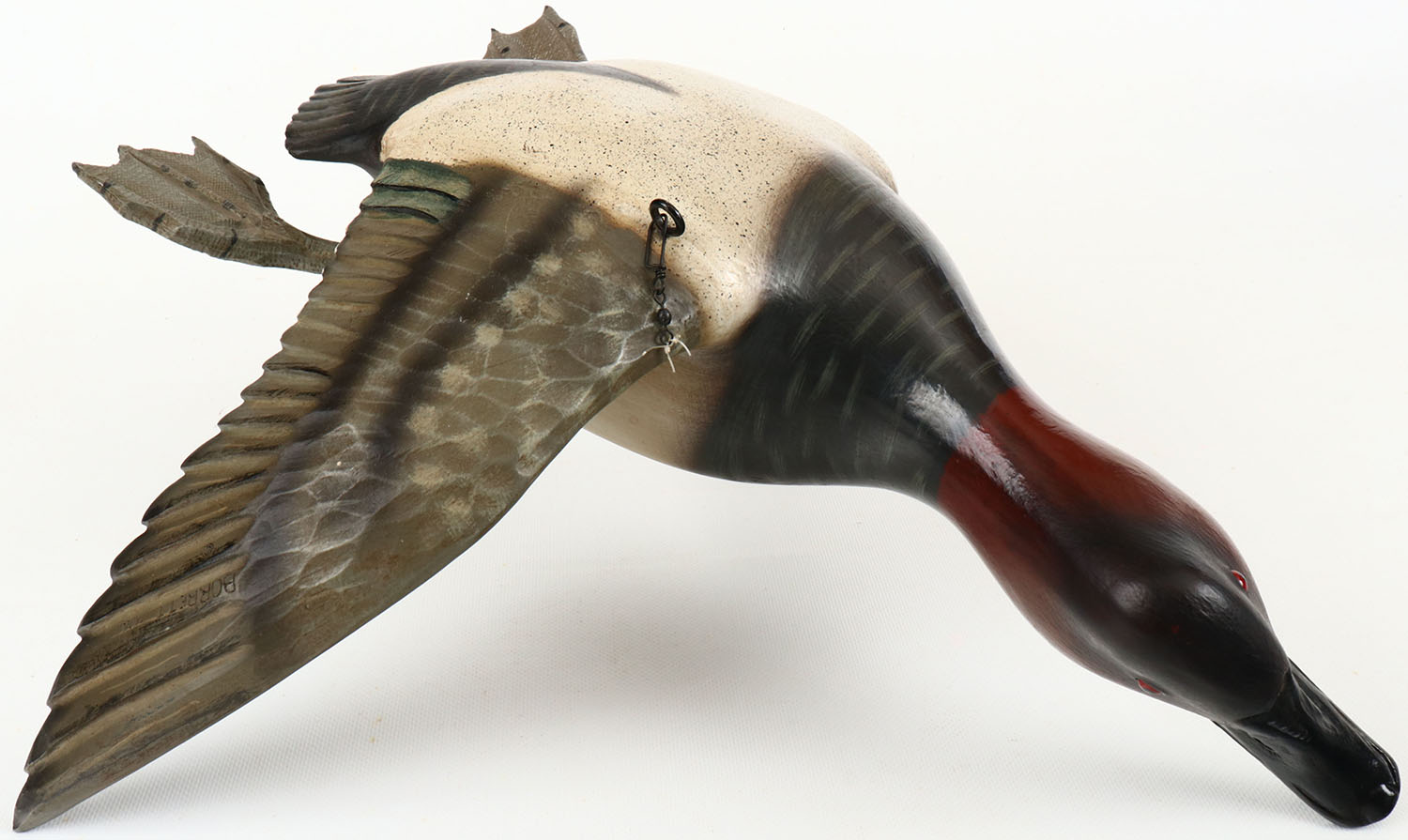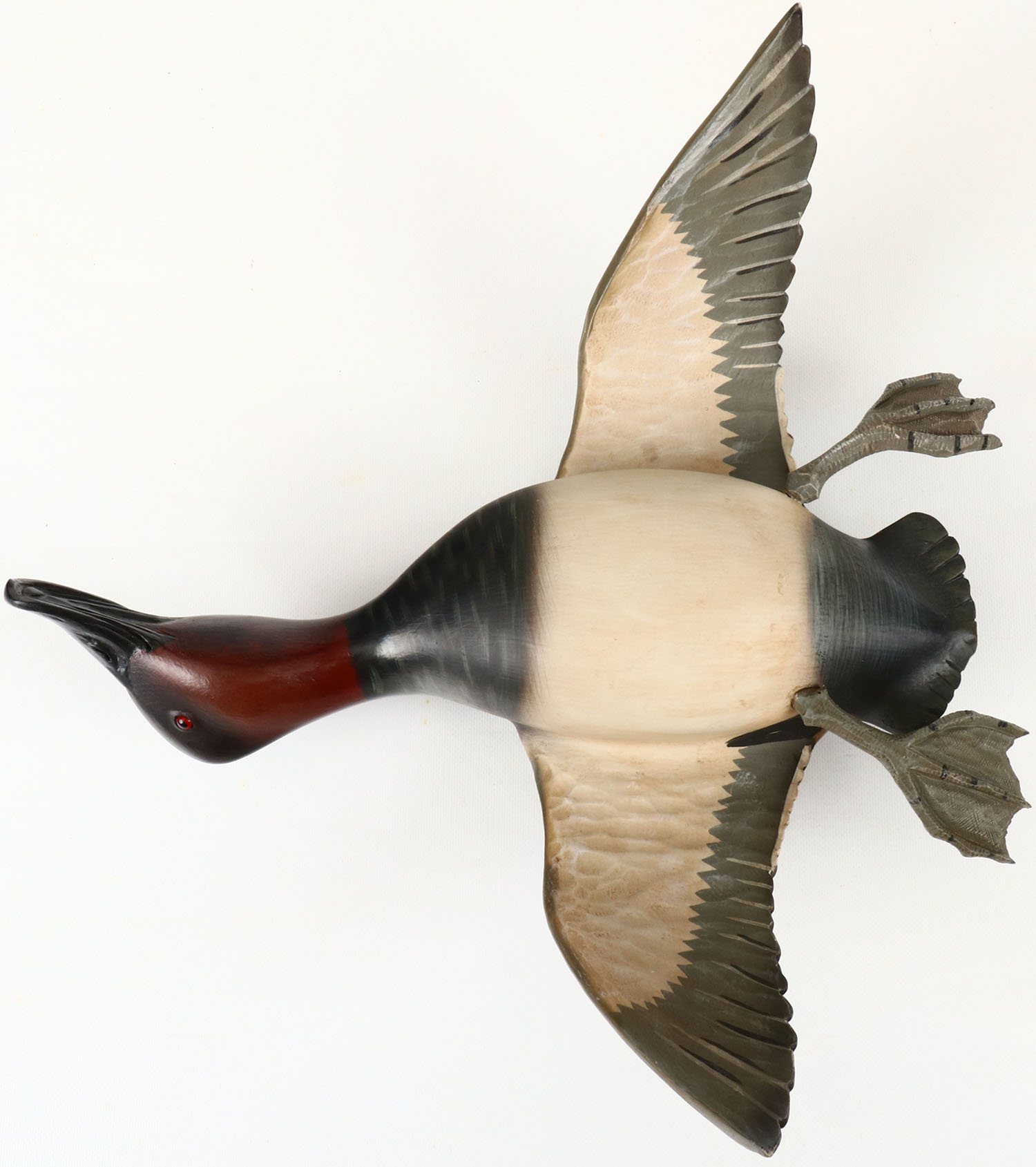 Ducks Unlimited Reproduction of a Flying Canvasback Drake by Borrett, Made of resin, glass eye, structurally excellent after left leg repair. Excellent paint. Grade: Excellent+ - Value: 100 to 500