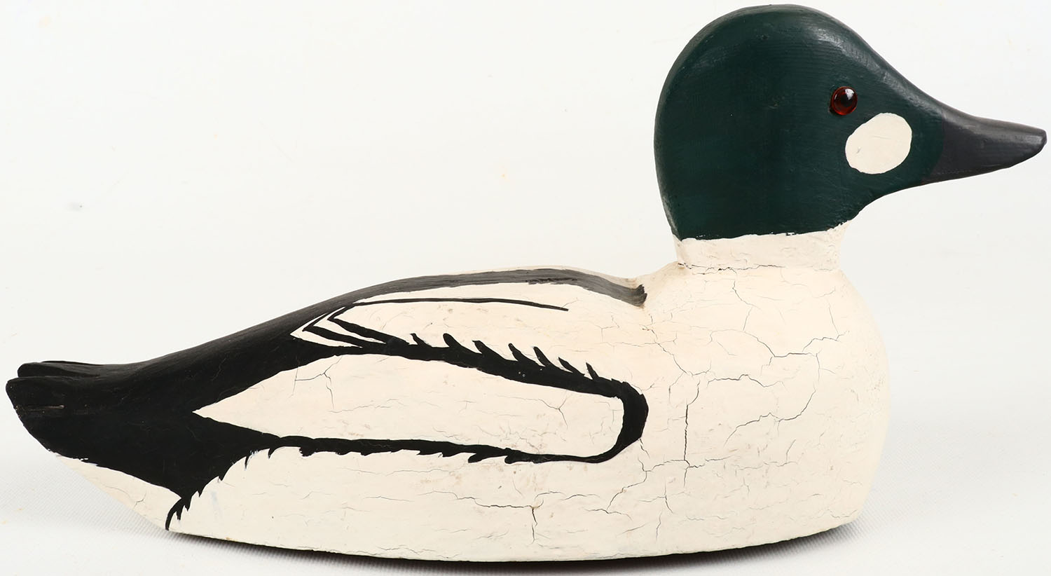 Goldeneye Drake by unknown maker, glass eyes, solid wood, original paint shows crazing. Grade: Excellent - Value: 30 to 60