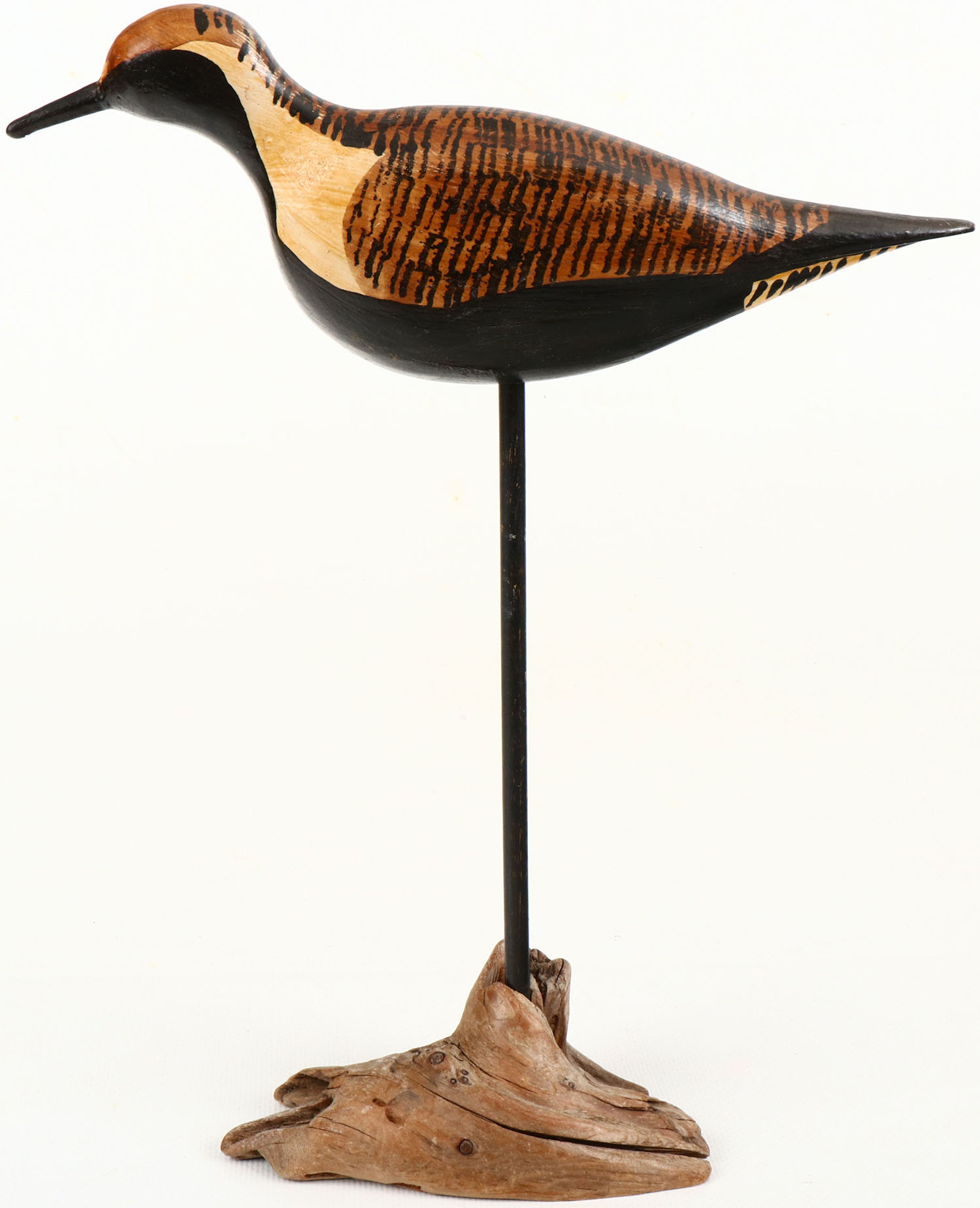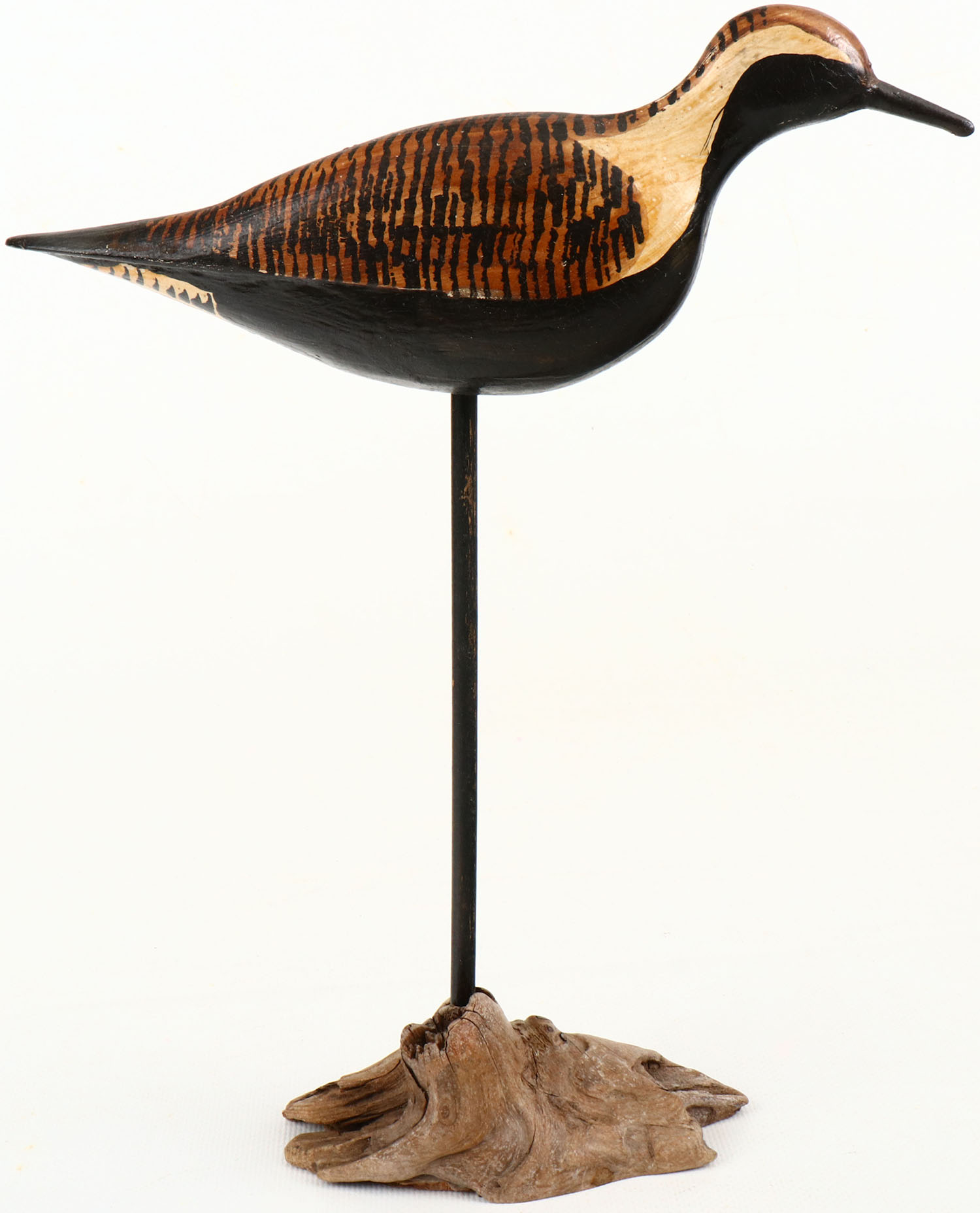 Black Belly Plover by unknown maker, no eyes, solid wood, on wood stand, excellent original paint. Grade: Excellent + - Value: 30 to 60